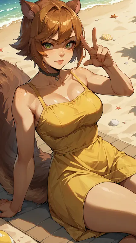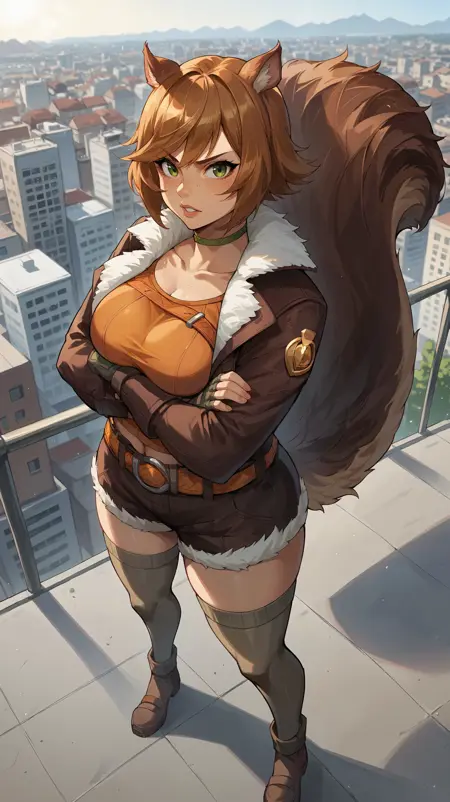 squirrel girl, short hair, brown hair, green eyes, animal ears, squirrel ears, squirrel tail, freckles, green choker, brown jacket, open jacket, cropped jacket, brown fur trim, orange top, midriff, orange belt, brown short, beige gloves, fingerless gloves, beige thighhighs,