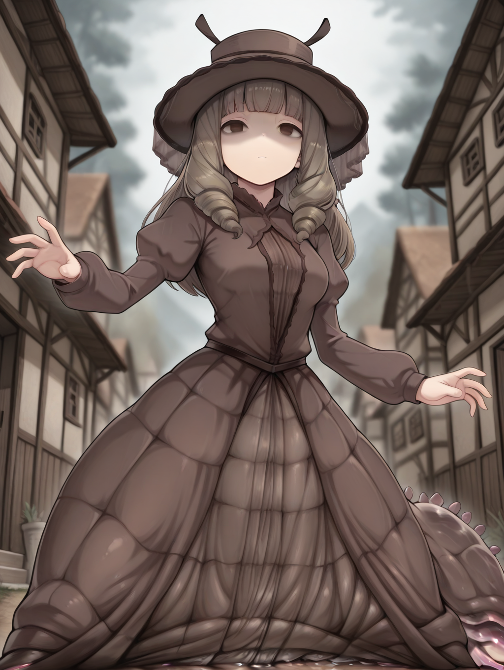 梅尔克,棕色头发,长发,钻头发型,刘海,棕色眼睛,蛞蝓女孩,触角,中等胸部,面部阴影,帽子,长袖,棕色连衣裙,朱丽叶袖,