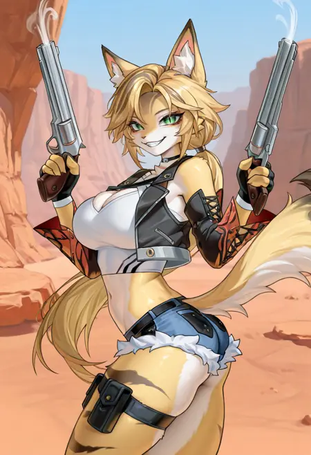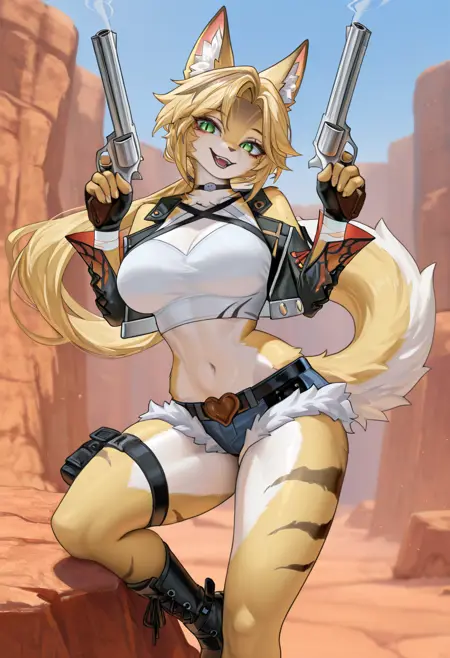 --v1 NXL-- [LoCon] 在 NoobAI EPS v1.1 上训练,已在 Nova Furry XL (Illu v3) 上测试。 服装如常完全可控,一些较小的细节尚不稳定。 通用优点:zzzpulc、绿眼睛、竖瞳、低马尾、长马尾 服装优点:面具、无袖夹克、短上衣、热裤、心形扣、可拆卸袖子、腿部收纳袋、开脚靴