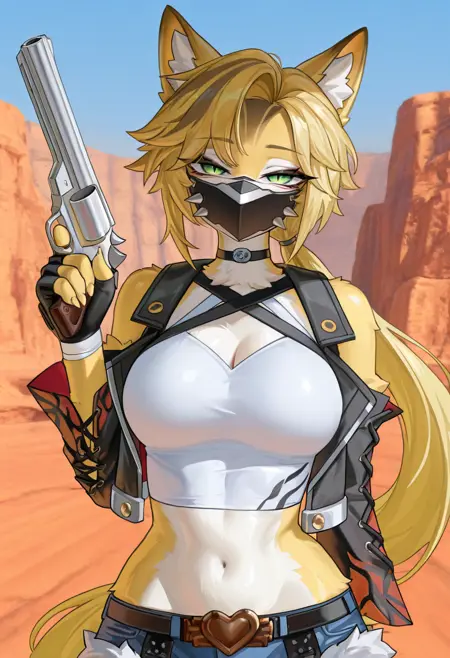 Outfit positives: mask, sleeveless jacket, crop top, hotpants, heart buckle, detached sleeves, leg pouch, open boots