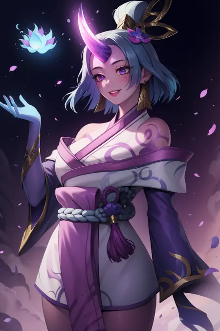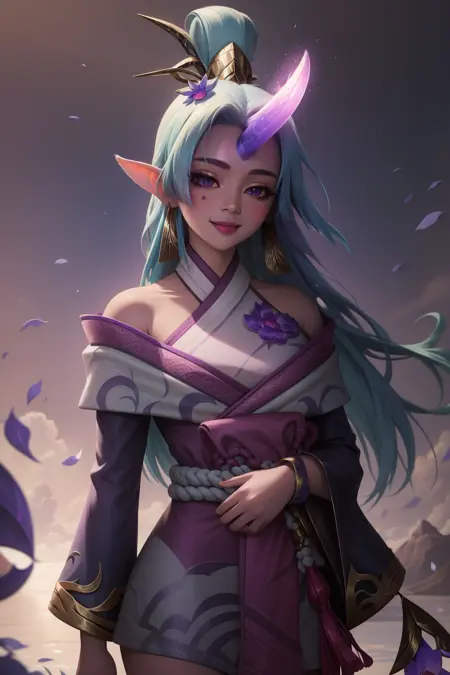 タグ: spirit blossom soraka, 1girl, 紫色の肌, 色付きの肌, 単一の角, 着物, 髪飾り, 肩出し, 長い髪