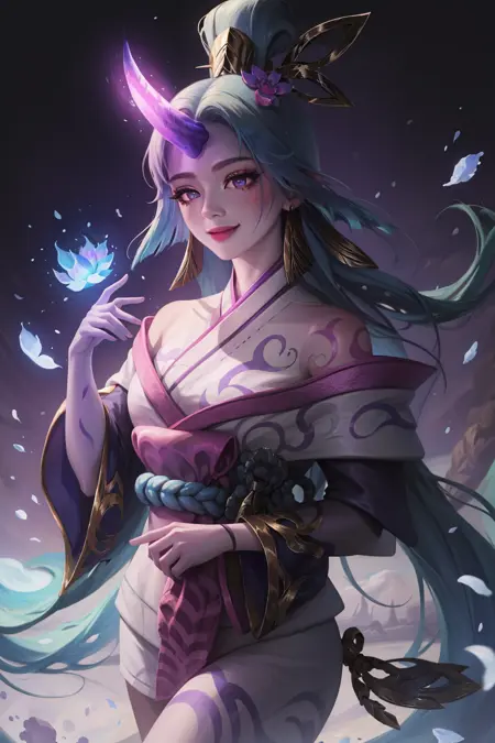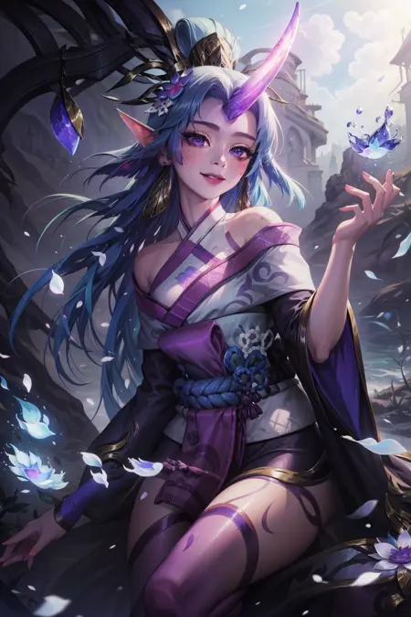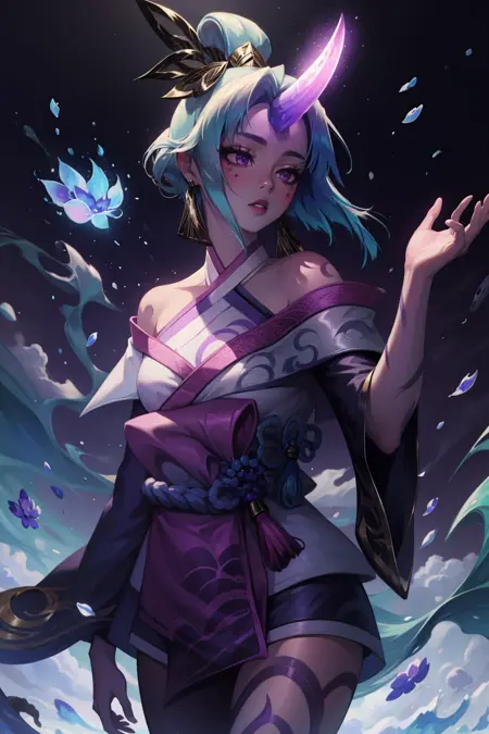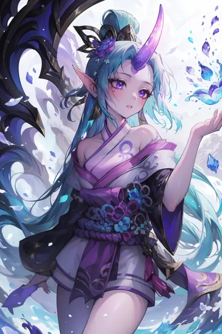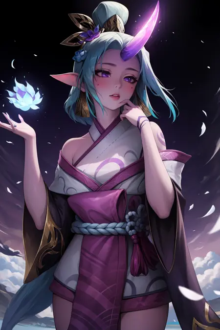 标签:spirit blossom soraka, 1girl, 紫色皮肤, 彩色皮肤, 单角, 和服, 头饰, 裸肩, 长发