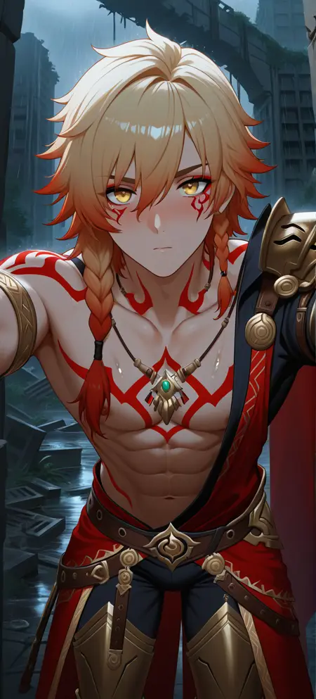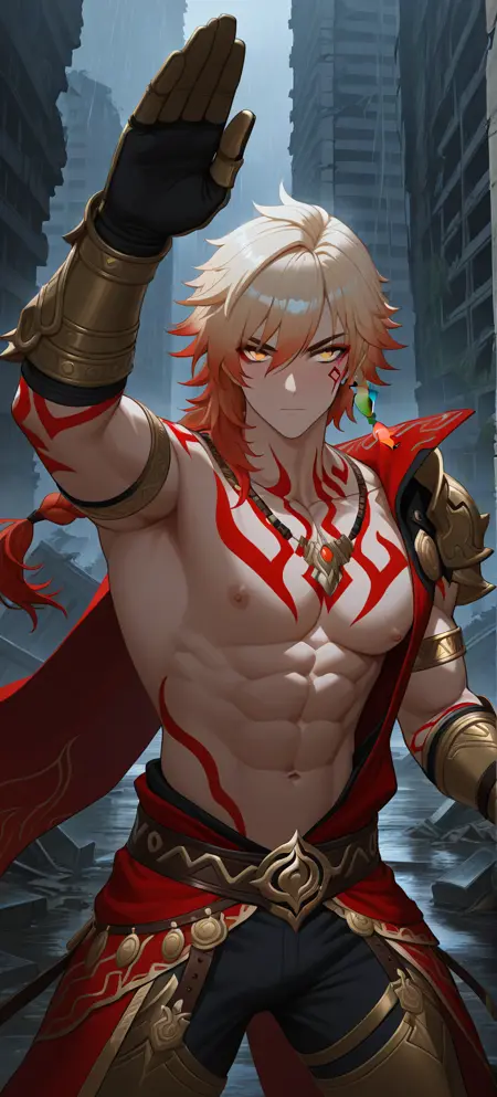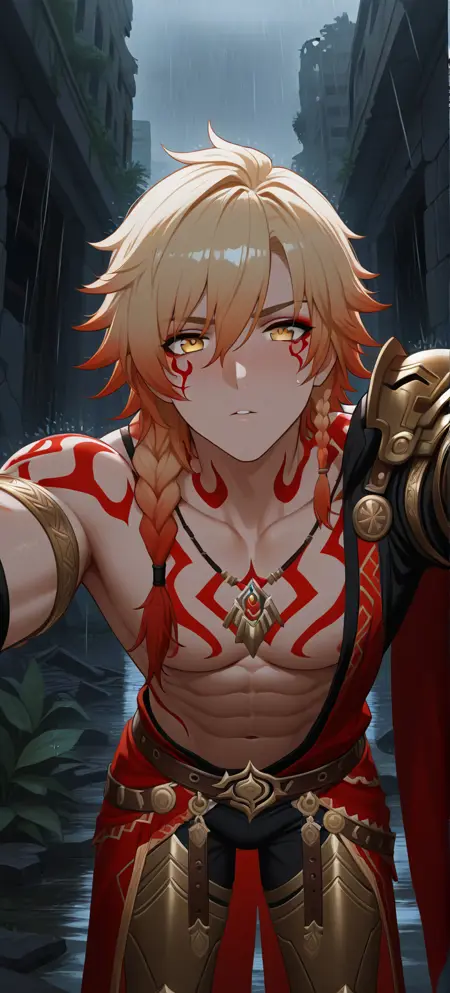 ワンディ、黄色い瞳、グラデーションの髪、片側の編み込み、胸筋、腹筋、腕輪、タトゥー、ボディペイント、ガントレット、鎧、赤いアイシャドウ、赤いマント、肩甲板、顔のタトゥー、ネックレス、ジュエリー,