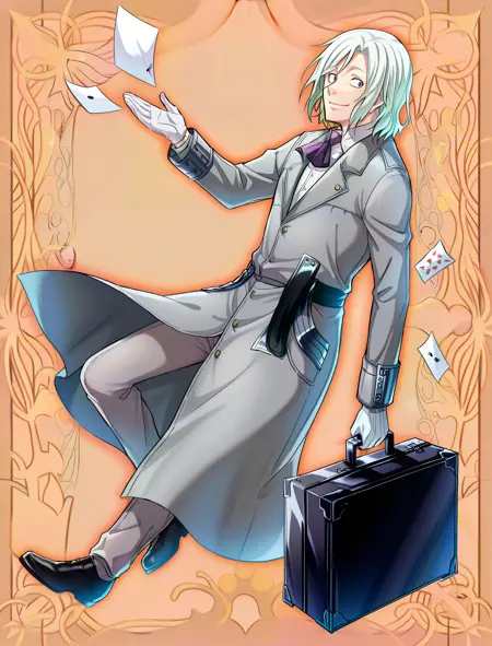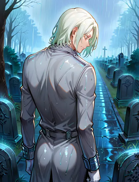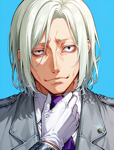 white shirt, frilled collar, grey jacket, white gloves, white pants