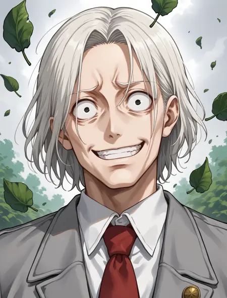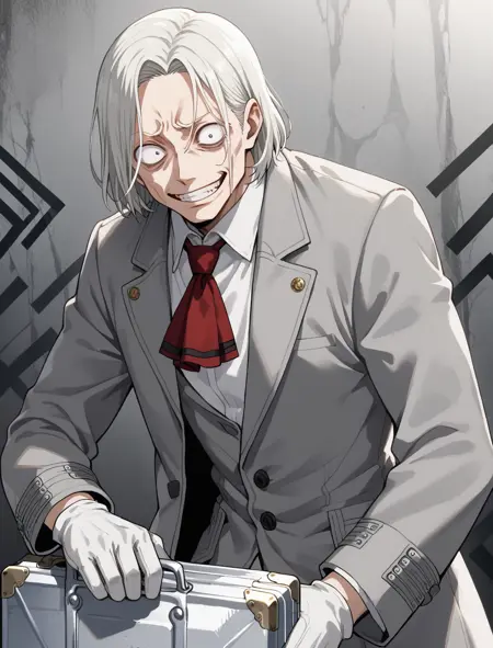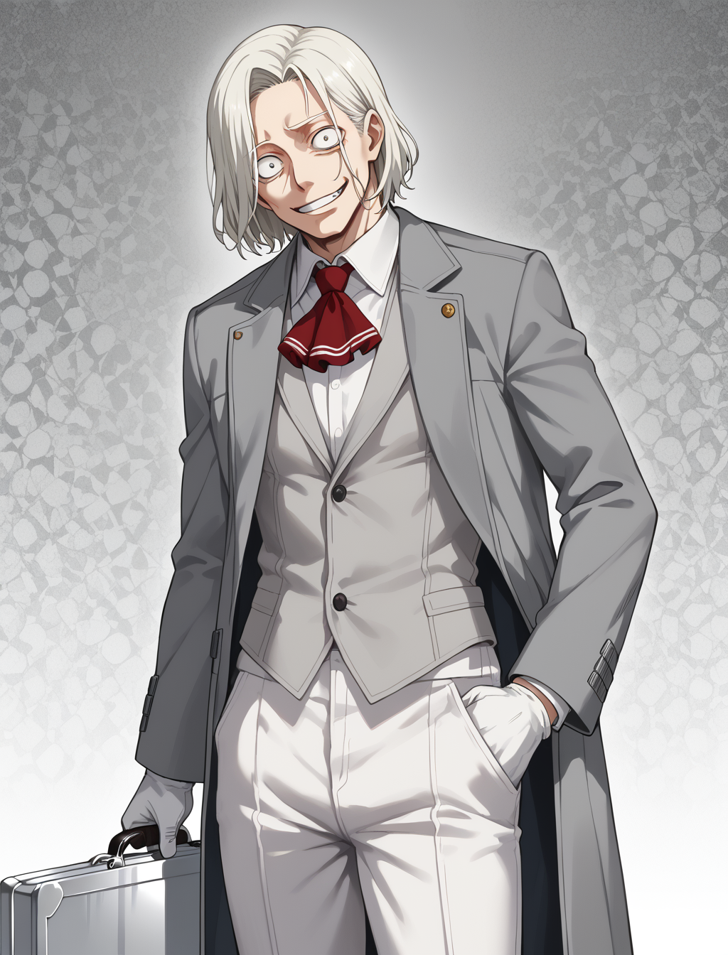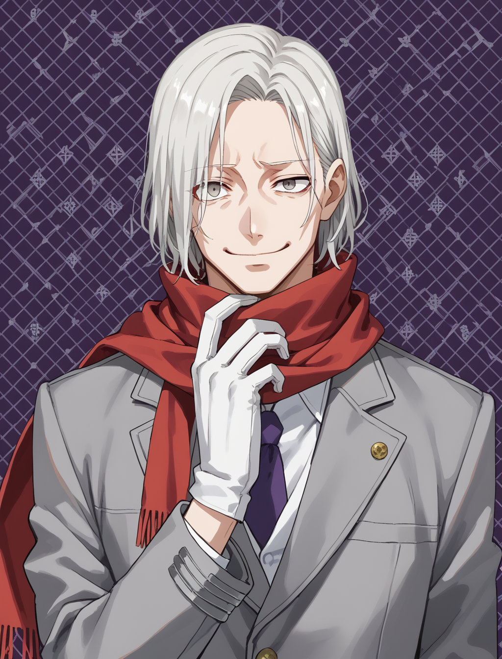 white shirt, frilled collar, grey jacket, white gloves, white pants