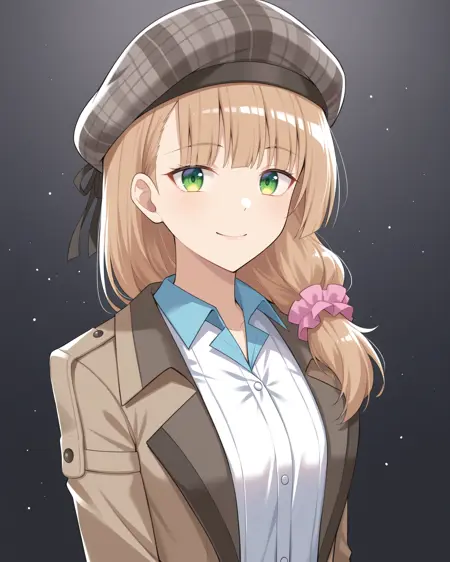<lora:MarielleAyme_Illustrious:1>, Marielle Ayme, 녹색 눈, 연한 갈색 머리카락, 어깨에 걸친 머리카락, 분홍색 헤어バンド, 작은 가슴, 회색 베레모, 모자 리본, 체크무늬 머리장식, 갈색 코트, 목스타일 셔츠, 회색 체크무늬 반바지, 빨간 팬티스타킹, 흰색 무릎 부츠, 하이힐 부츠,