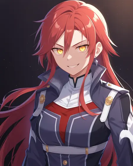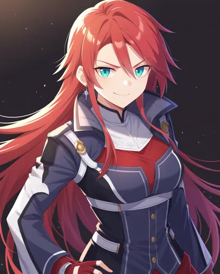 <lora:CelisOrtesiaRaceQueen_Illustrious:1> Celis Ortesia, 빨간 머리, 긴 머리, 어깨 위의 옆머리, 청록색 눈, 중간 크기의 가슴, 귀걸이, 머리 위의 안경, 레이스 퀸 복장, 자켓, 빨간 소매, 짧은 반바지, 검은 허벅지 부츠,