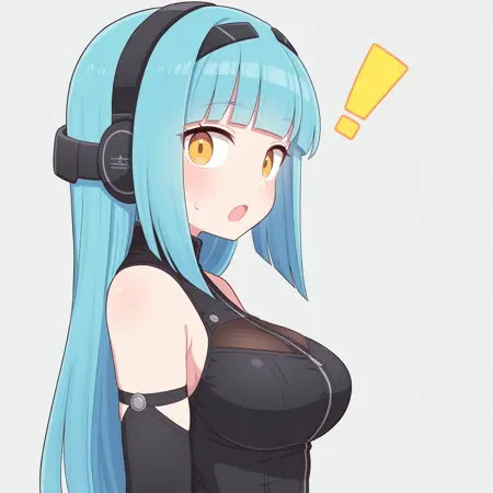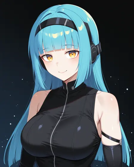 <lora:RisetteTwiningsCombat_Illustrious:1>, Risette Twinings, yellow eyes, blue hair, long hair, blunt bangs, large breasts, hairband, headphones, black dress, black thighhigh boots, black elbow gloves