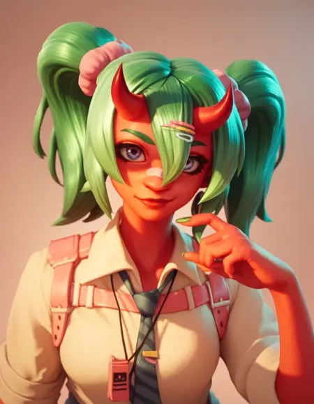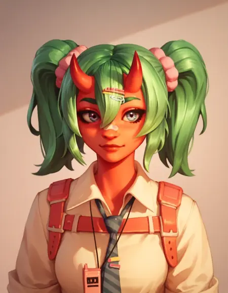 | 训练词汇 | Nemia, red skin, green hair, twin tails, hair between eyes, lilac eyes, bandaid on nose, horns已复制! white shirt, blue sweatshirt around waist, black skirt, black tie, pink straps on shirt, long sleeves, rolled-up sleeves, bracelets, retro pink charm on a necklace, pink gloves, yellow loose socks with brown stripes, white shoes, pink knee brace on one leg, hair clips已复制! |