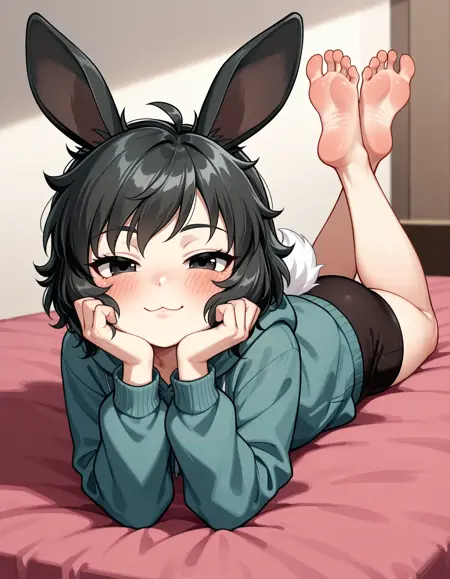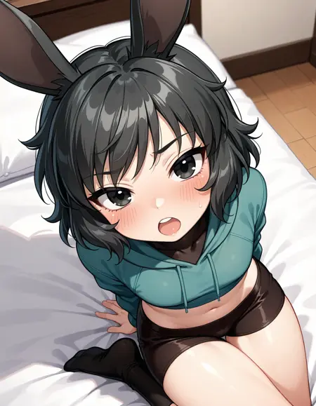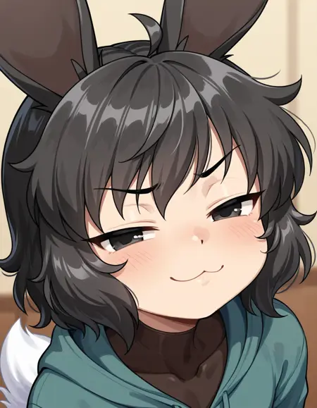 k3n、短い髪、黒髪、うさぎの耳、ほくろ、白い尾、男の子