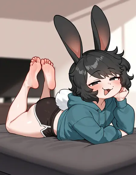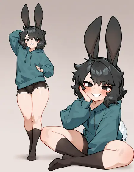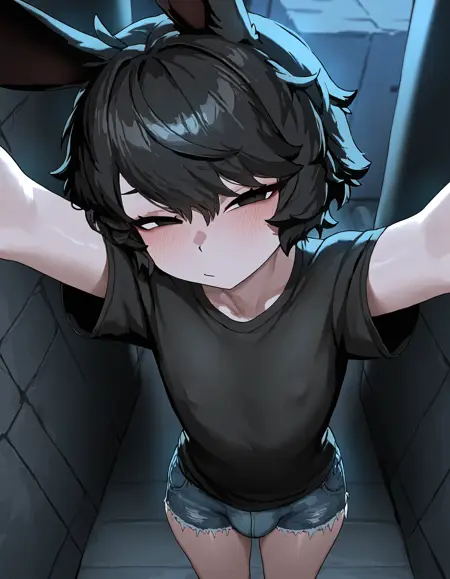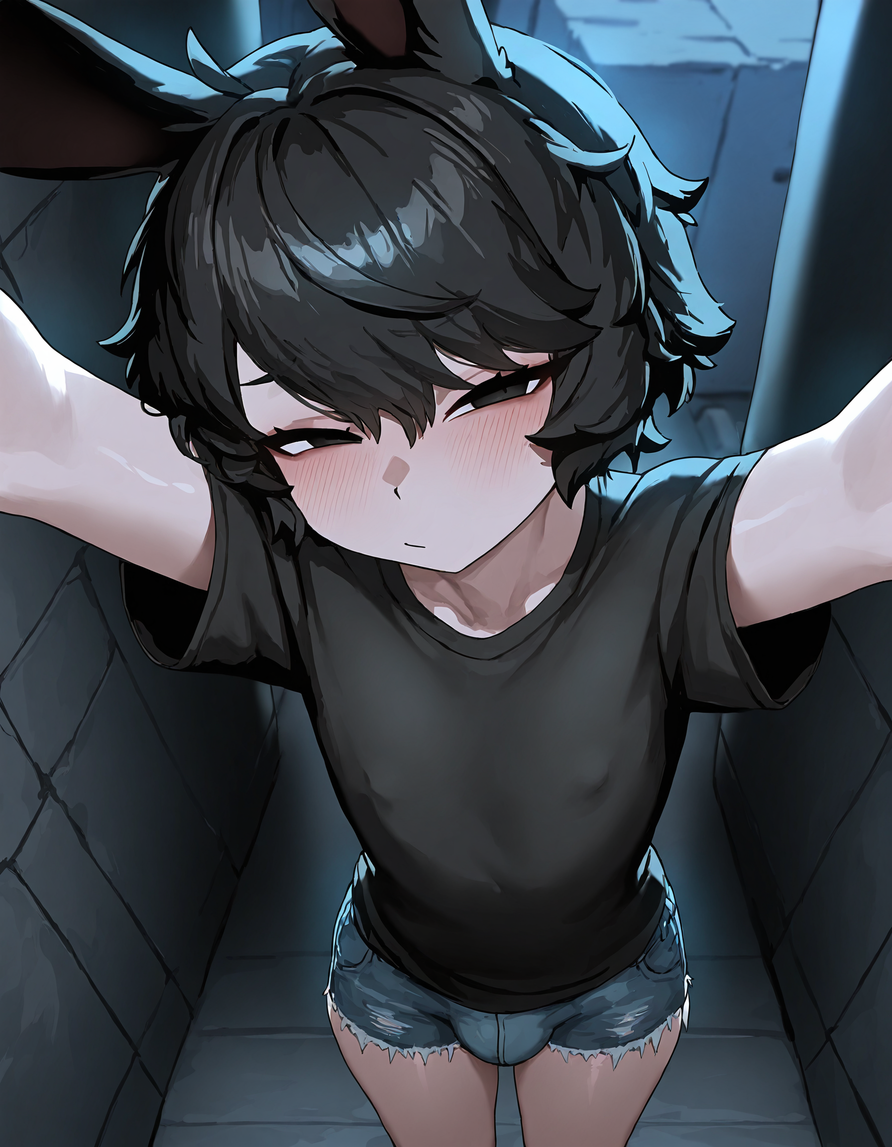 k3n, short hair, black hair, rabbit ears, mole, white tail, otoko no ko