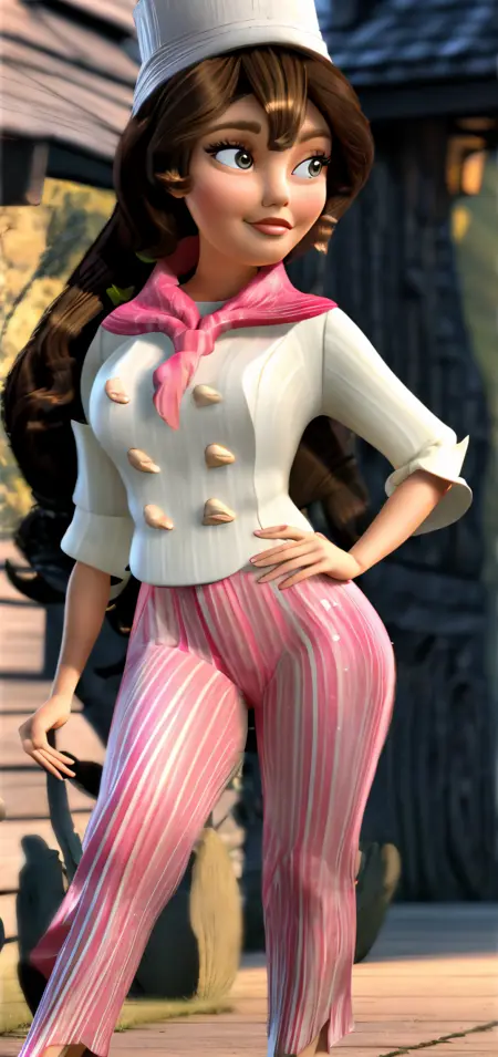 g3lata, 1girl, solo, brown hair, long hair, low ponytail, brown eyes, lipstick, pointy ears, chef, chef hat, flat top chef hat, double-breasted jacket, ascot, short sleeves, long skirt, striped pants, flats