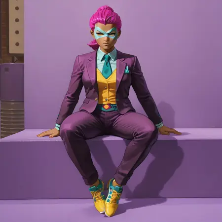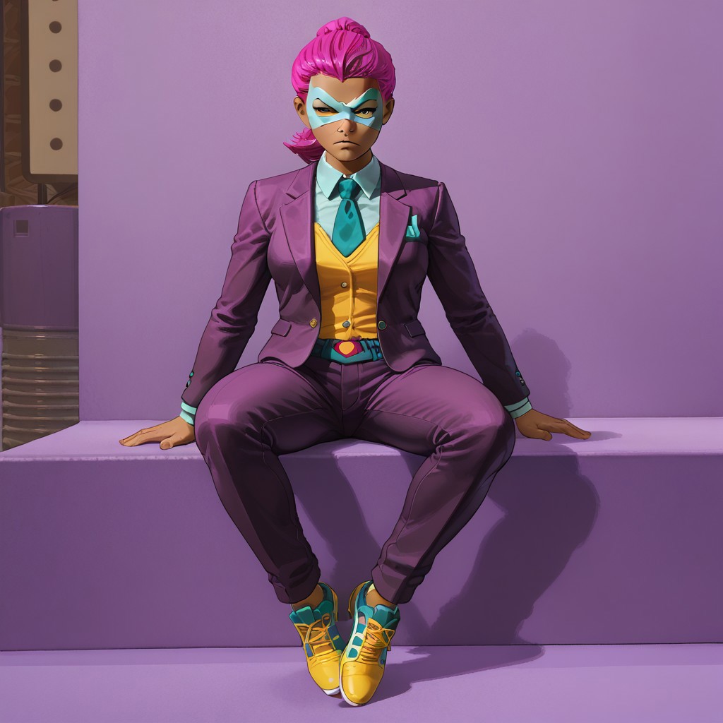 额外标签为:紫色眼睛,紫色口红,摔跤服,多米诺面具