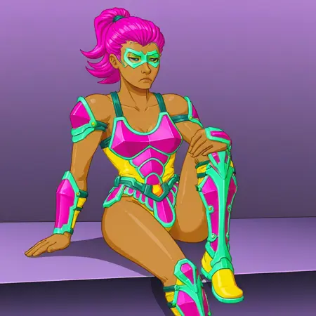 一般标签为:1girl,solo,深色皮肤,盔甲,靴子,紧身衣,马尾,粉发,面具