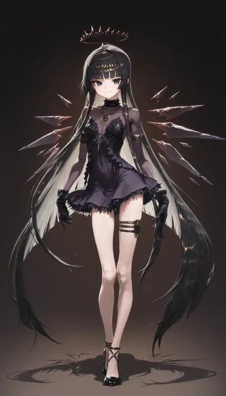 翅膀臂带,黑色手套,单侧大腿带,透明紧身衣,裸腿,娃娃裙,蕾丝镶边连衣裙,遮盖肚脐,荷叶边项圈,短裙,透明胸脯,脚踝链,oneness高跟鞋,