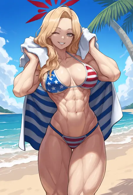 항상 필요: "회색 눈, 금발, 긴 머리, 눈 밑 점, 빨간 환영, 큰 가슴, 근육질의 여성"
