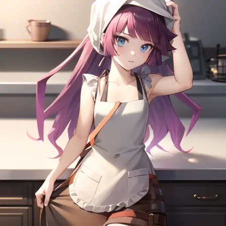 厨房服装:黑衬衫,腰带,红裙,荷叶边,无袖,白色围裙,头巾,粉色围裙