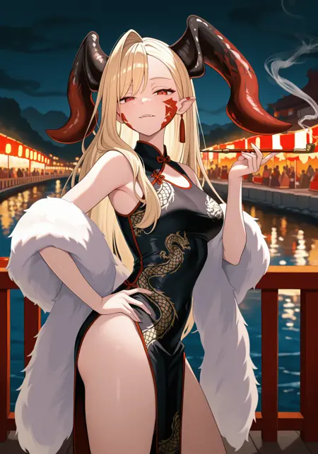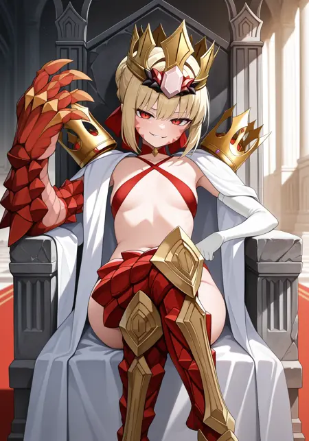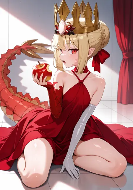 Ascension 1: red dress, red arm wrap, single elbow glove, dragon tail, crown on head