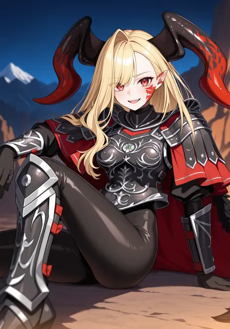 black bodysuit, black breastplate, pauldrons, two tone cape, long fur cape, two tone cape, arm guards, black gloves, short red shoulder capelet, armored boots