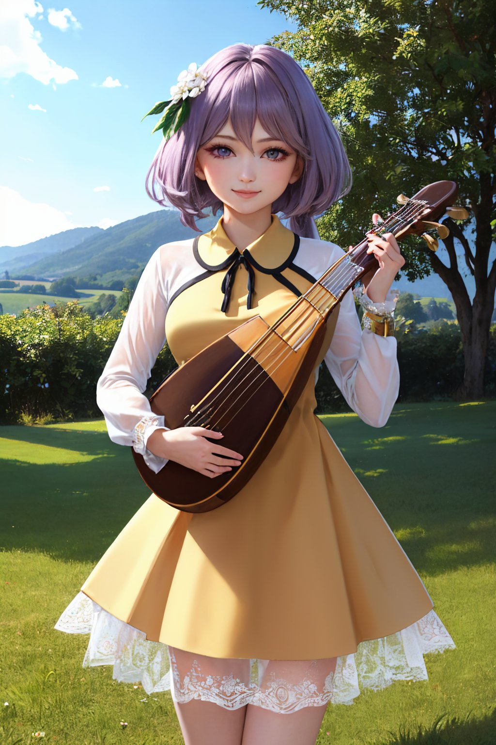 필요하면 purple hair와 purple eyes를 추가하세요. holding, instrument, lute \(instrument\)를 프롬프트로 사용하면 잘 작동합니다.