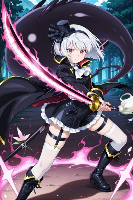 konpaku youmu, 1girl, solo, red eyes, white hair,, konpaku youmu \(lady mortal phantasm\), alternate costume, mini top hat, hat bow, black bow, fascinator, black hairband, hairband, mystical high collar, black coat, open coat, white ascot, layered shirt, black shirt, white shirt, leather skirt, lace-trimmed skirt, black skirt, frilled skirt, white thighhighs, garter straps, thigh strap, knee boots, lace-up boots, holding sword, pink aura, black ghost,