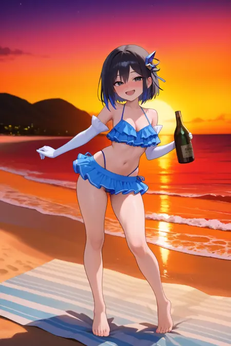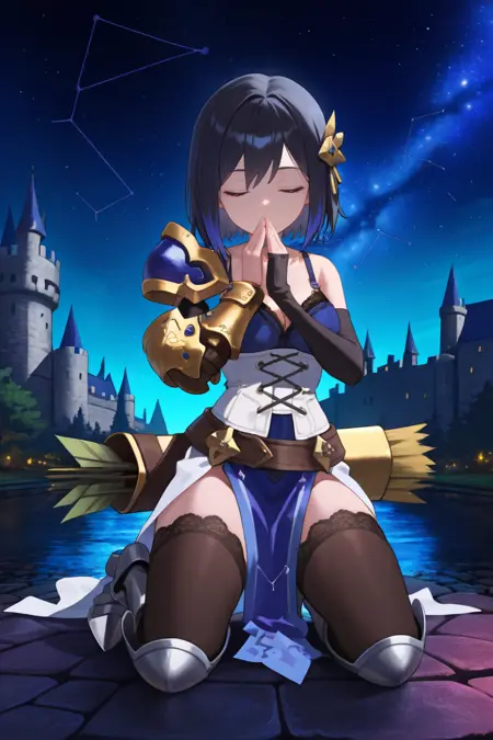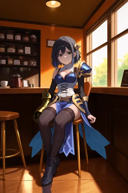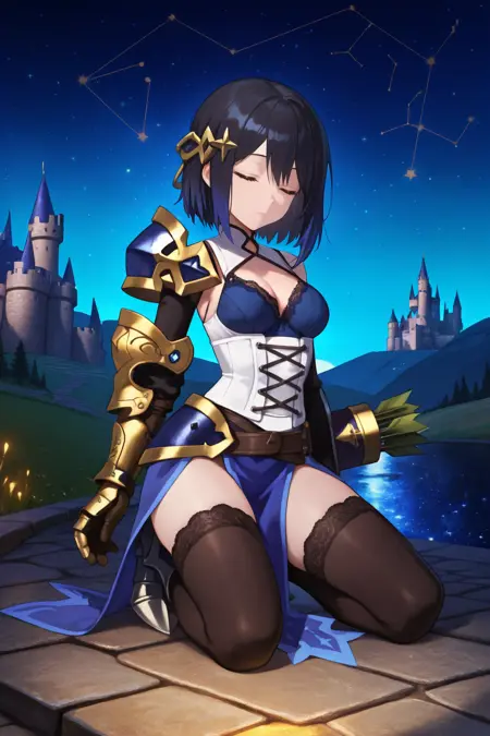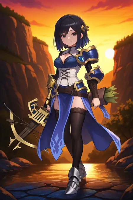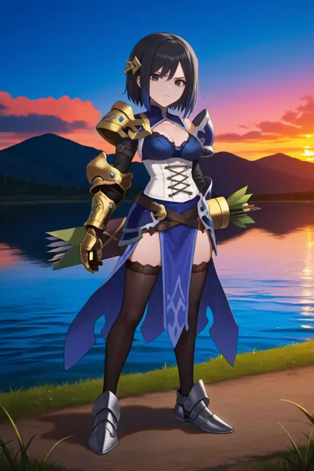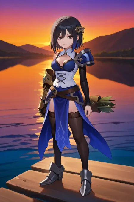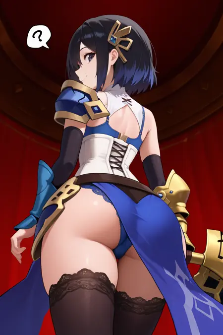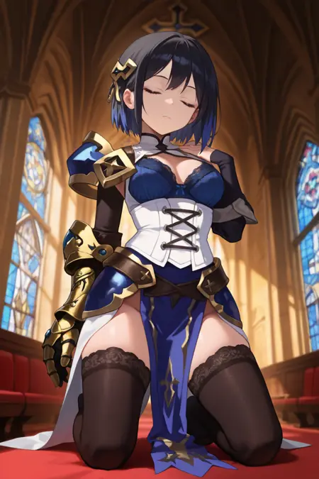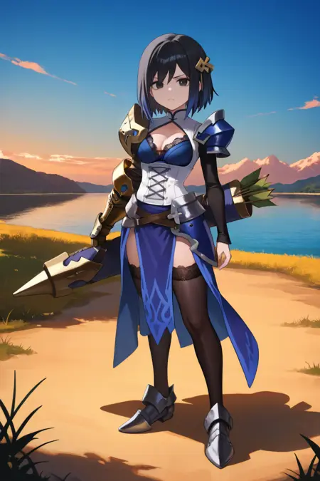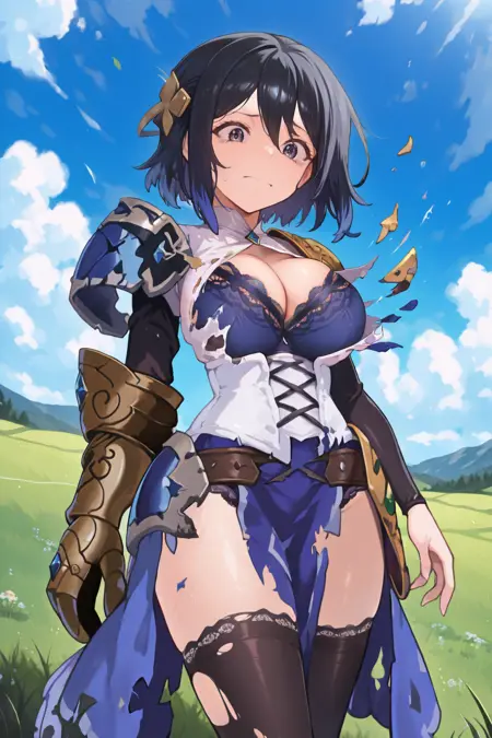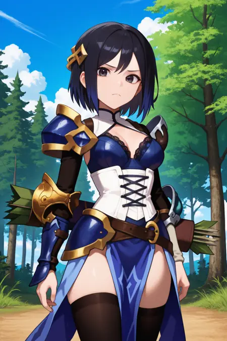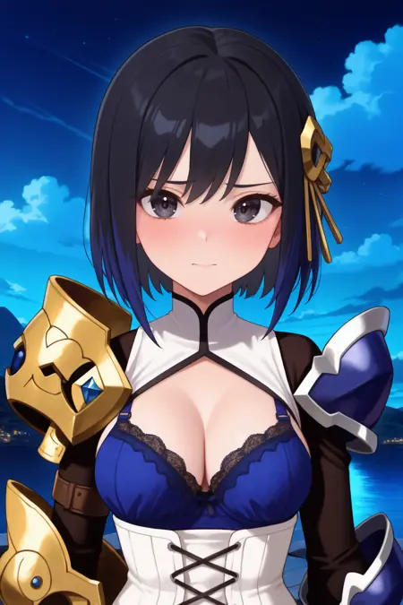 Helpful Tags: 1girl, black hair, short hair, colored tips, blue tips, black eyes, hair ornament, blue armor, clothing cutout, blue bra, lace-trimmed bra, single pauldron, single gauntlet, golden gauntlet, white corset, cross-laced corset, white shirt, open shirt, black sleeves, faulds, blue pelvic curtain, waist cape, lace-trimmed thighhighs, black thighhighs, armored shoes