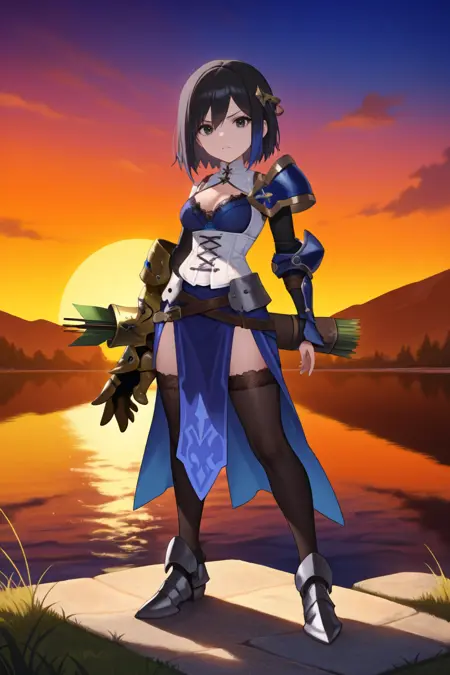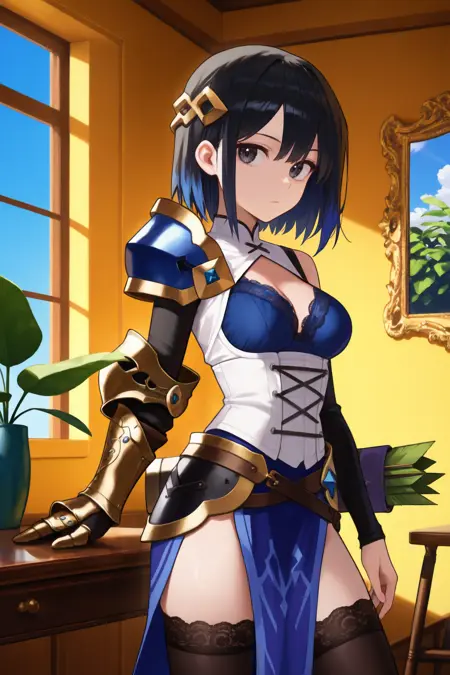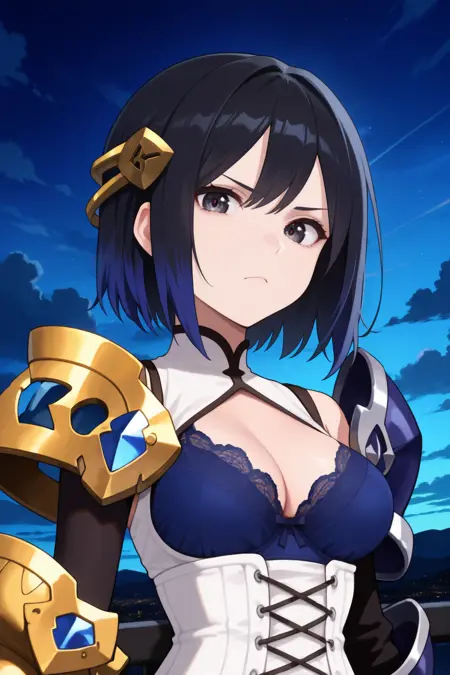 유용한 태그: 1girl, 검은 머리, 단발, 컬러링 끝, 파란색 끝, 검은 눈, 머리 장식, 파란 갑옷, 옷 잘린 부분, 파란 브라, 레이스 장식 브라, 한쪽 어깨 보호대, 한쪽 장갑, 금색 장갑, 흰색 코르셋, 십자 끈 코르셋, 흰색 셔츠, 벌어진 셔츠, 검은 소매, 허리 방어장치, 파란 골반 커튼, 허리 망토, 레이스 장식 허벅지 양말, 검은 허벅지 양말, 갑옷 신발