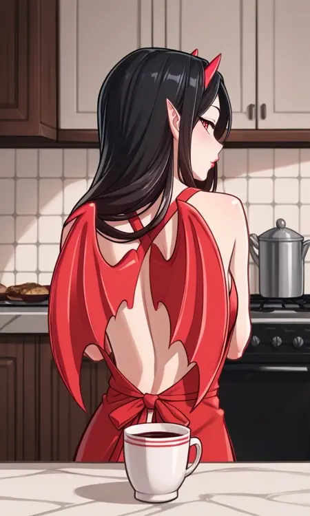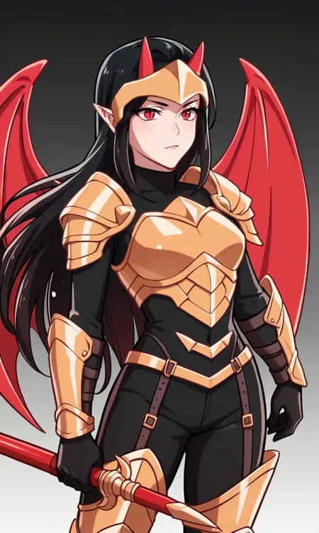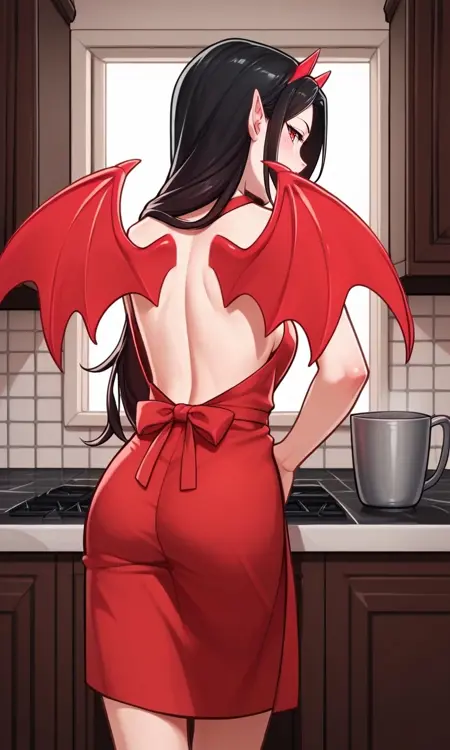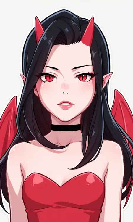 1girl, black hair, long hair, red eyes, slit pupils, red horns, bat wings, red wings, strapless dress, red dress, black choker, red lips