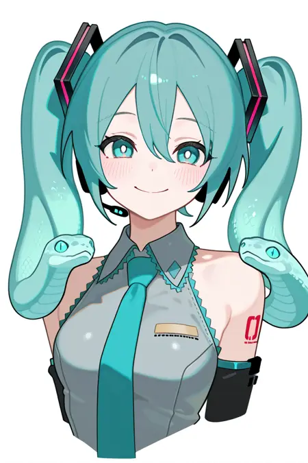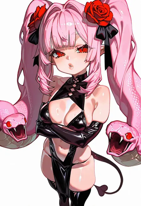 そのため、このLoRAを複数のコンセプトに分け、バリエーションとしてSNKHR(蛇の髪)を用いました。これはいくつかのヘアスタイルにも学習されていますが、特にツインテールが得意です(単一の蛇からツインテールを生成することを目的としたため、多くのツインテールを含めました)。