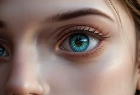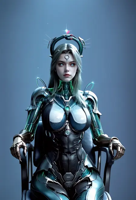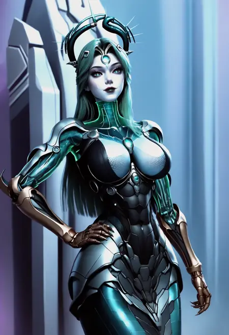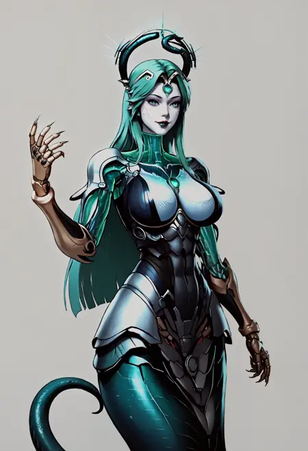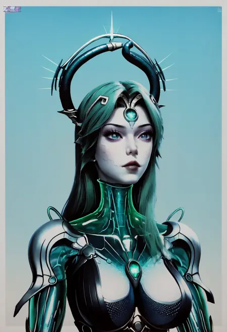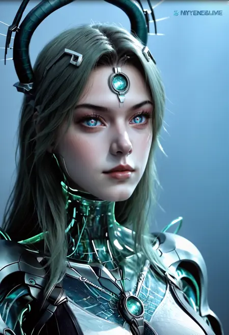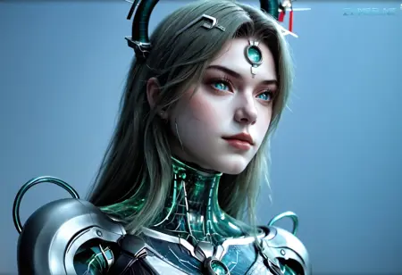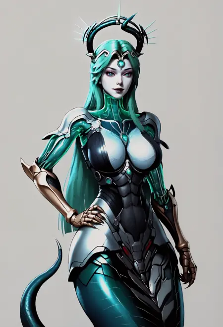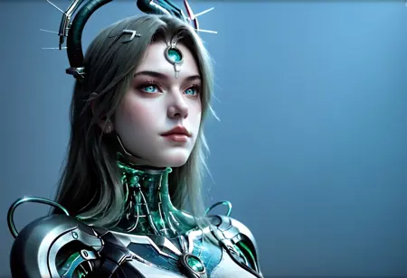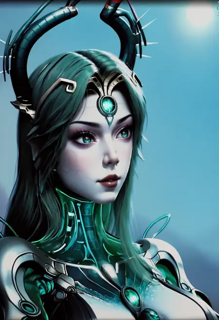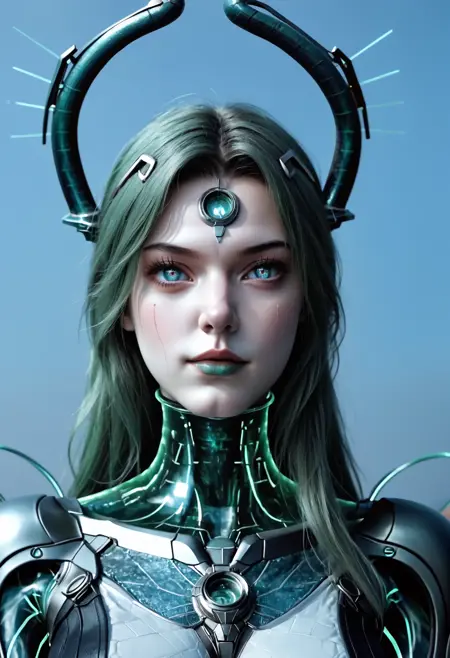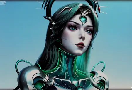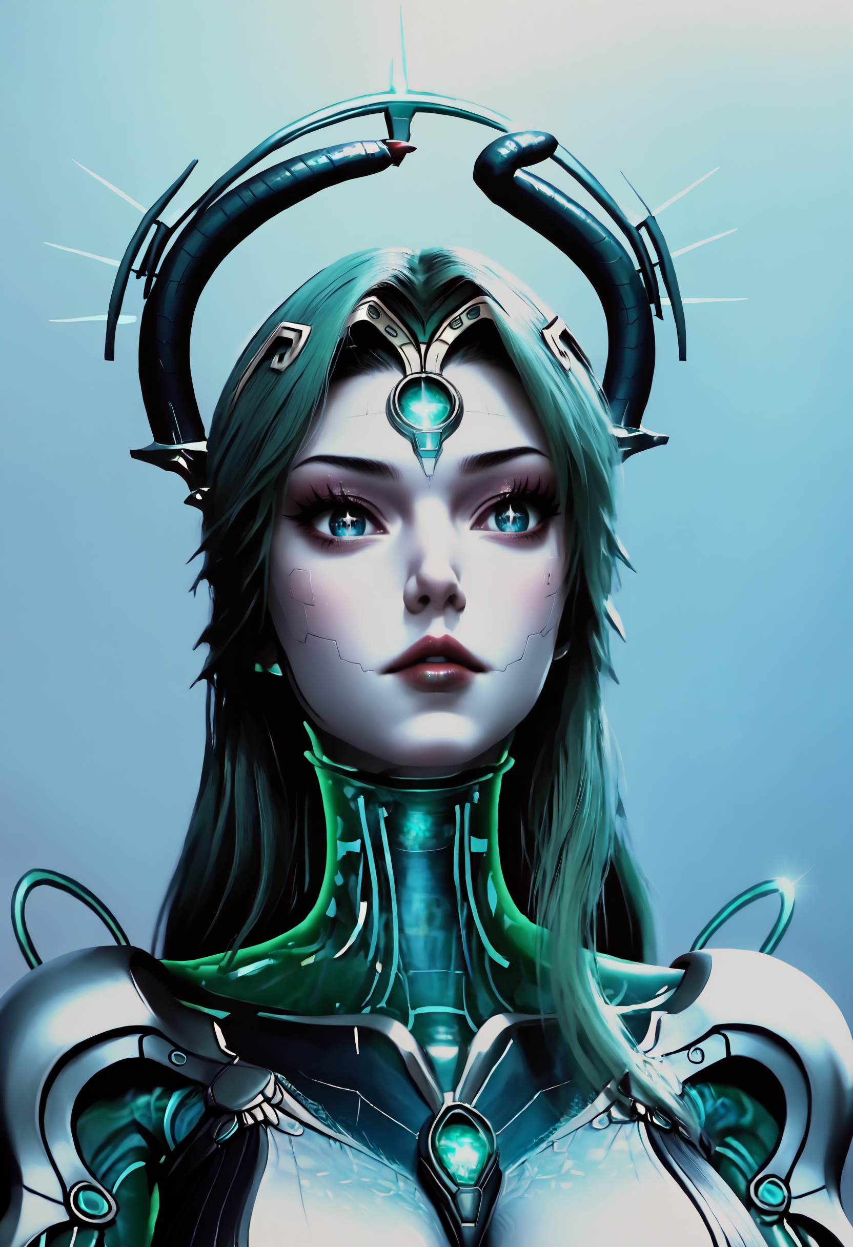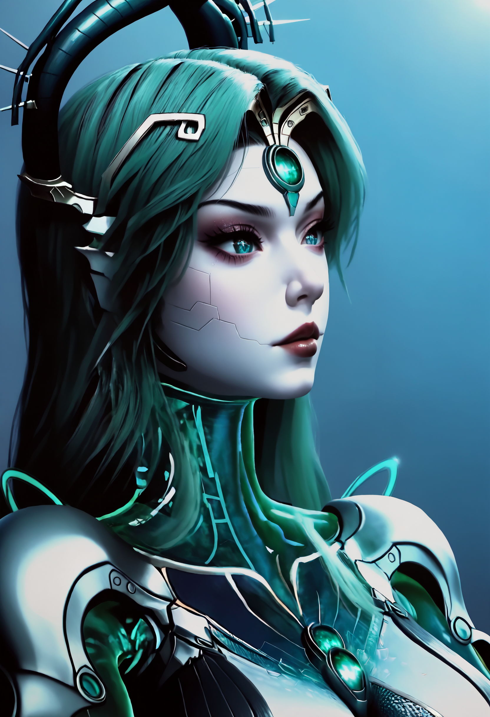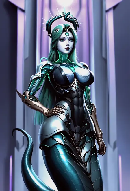 使用したキーワード: 蛇の女性、サイボーグ・ラミア、未来的な蛇テーマのキャラクター、バイオメカニカル・ハイブリッド、蛇の尾を持つ下半身、緑の髪、長い髪、額の宝石、ホログラム、アンドロイド、化粧、ロボット関節、金属製の体の部分、テアール色に輝く目、額の宝石、サイバーパンクな美意識、テクノ・オーガニックなデザイン、蛇の角、輝くテアール色のハイライト、ホログラフィックな要素、蛇の尾