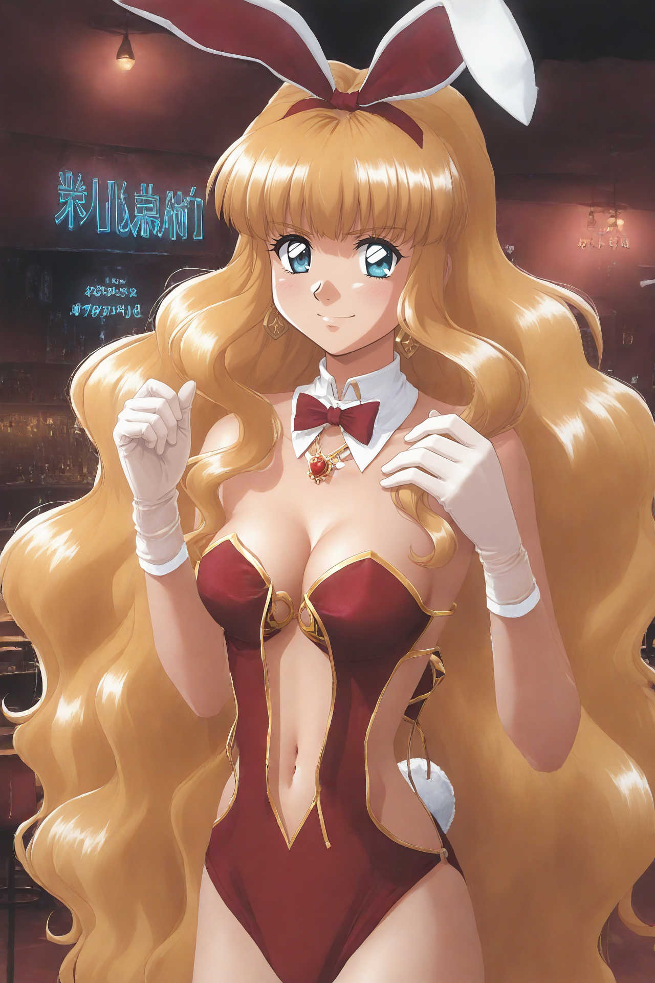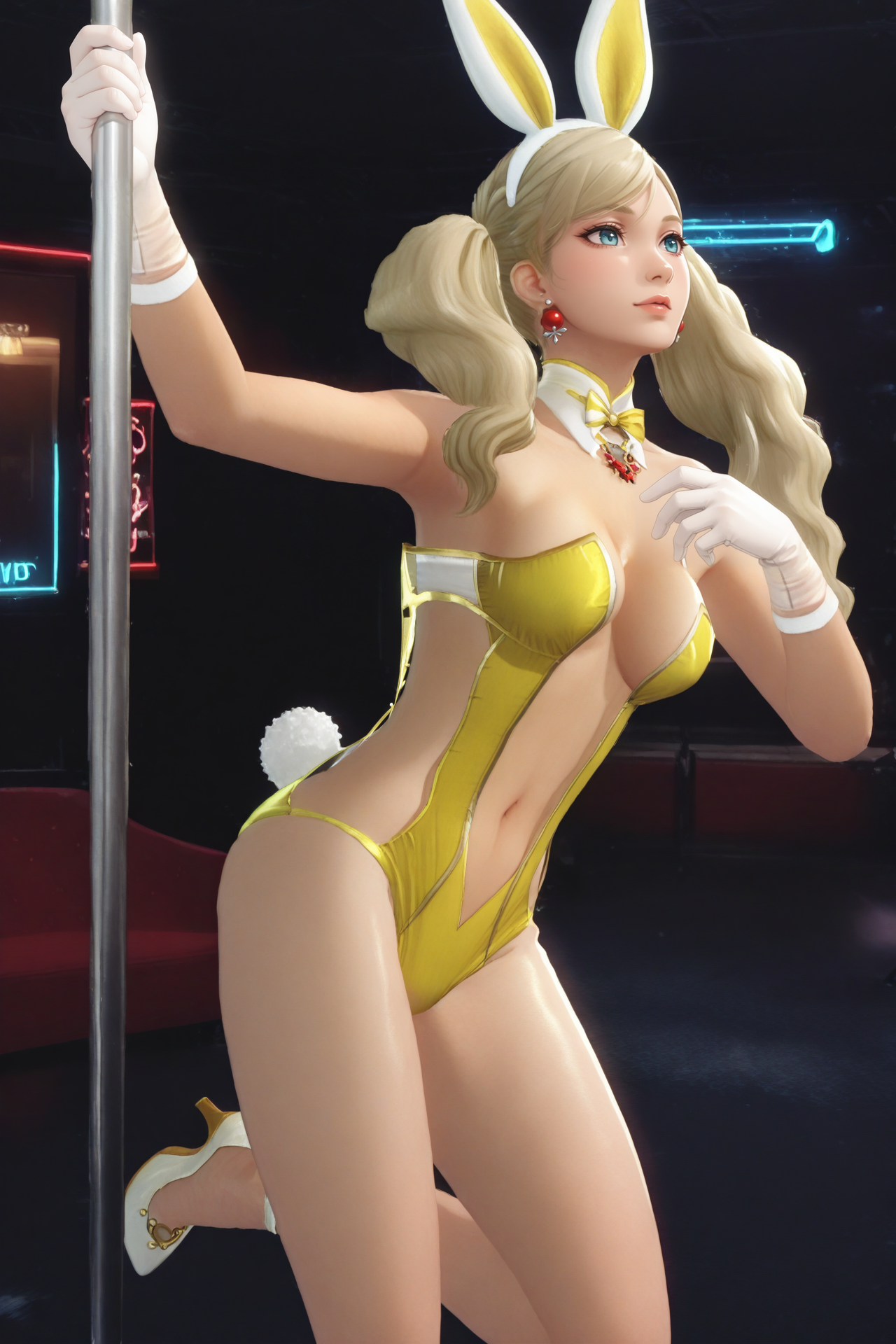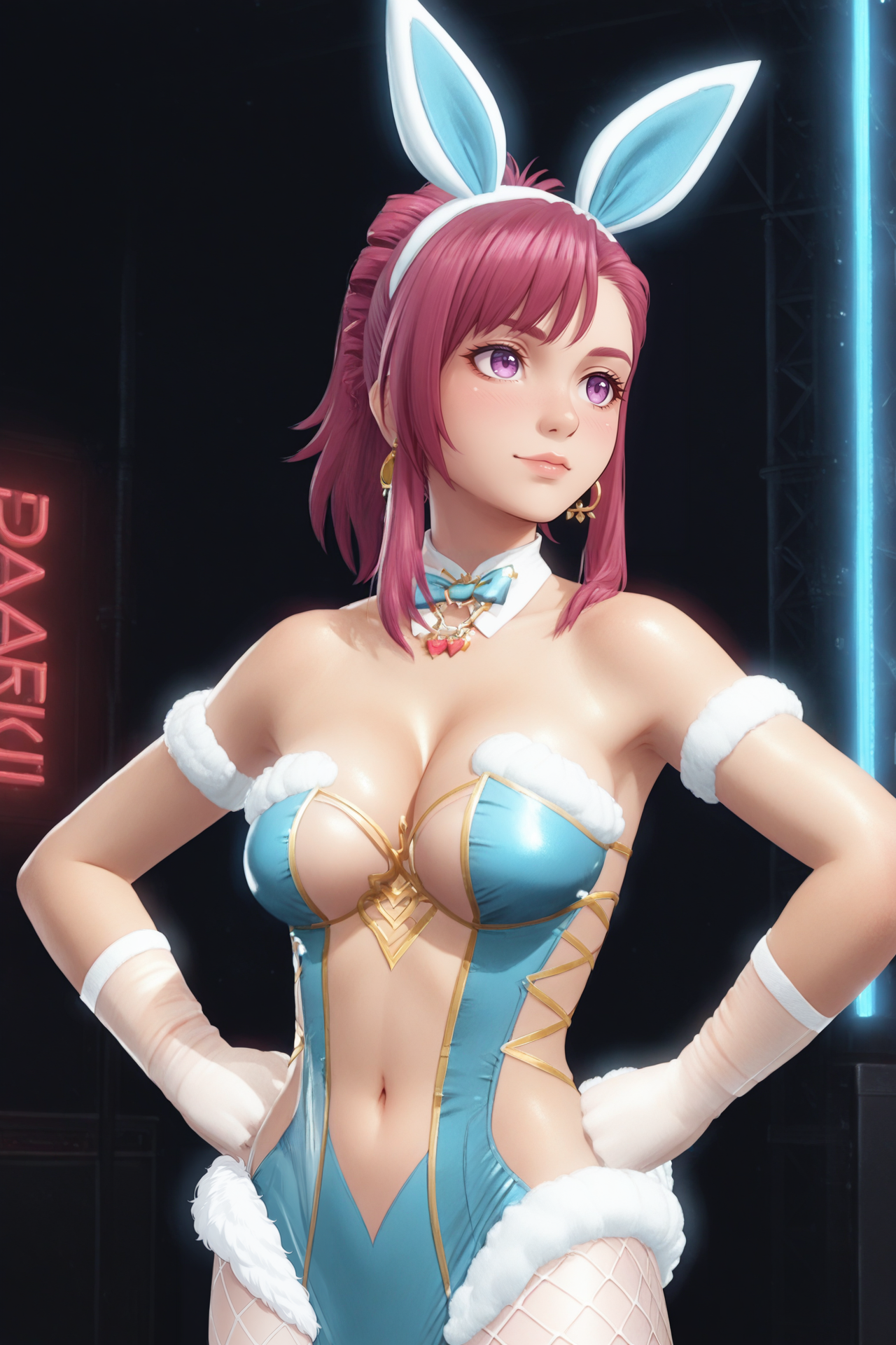 Normal Version: fishnet pantyhose, heart, {red|yellow|blue} leotard, fur trim, earrings, playboy bunny, rabbit tail, rabbit ears, bare shoulders, detached bowtie collar, white gloves, cleavage, navel, white high heels
