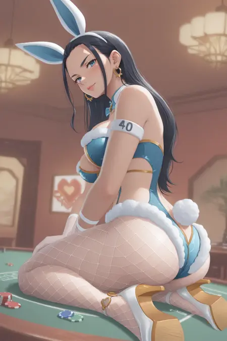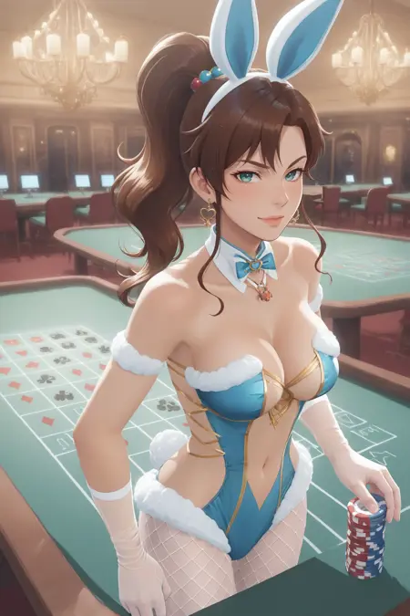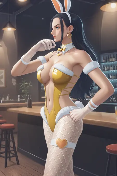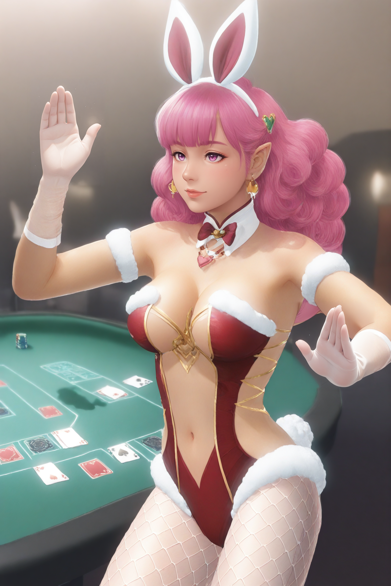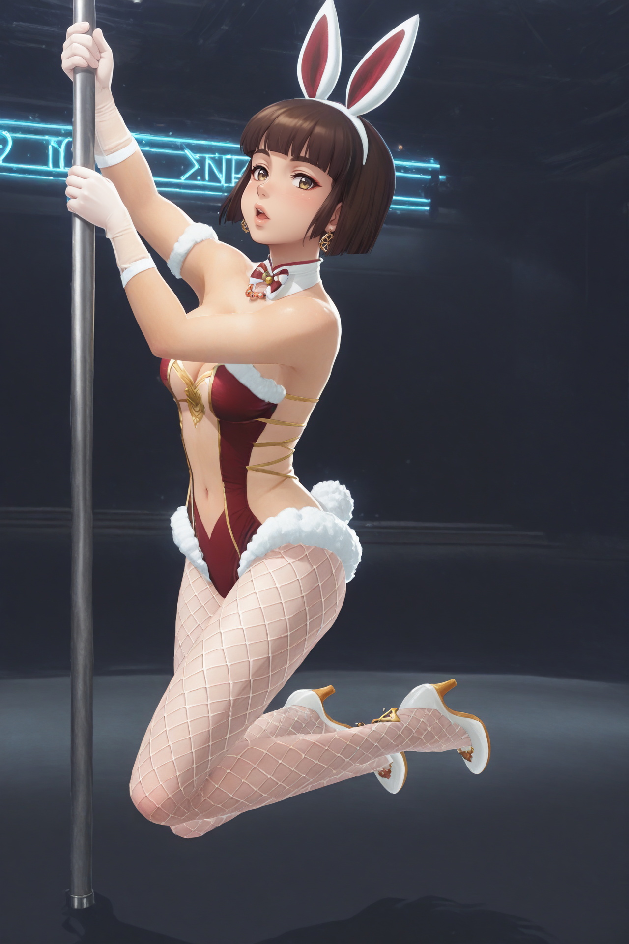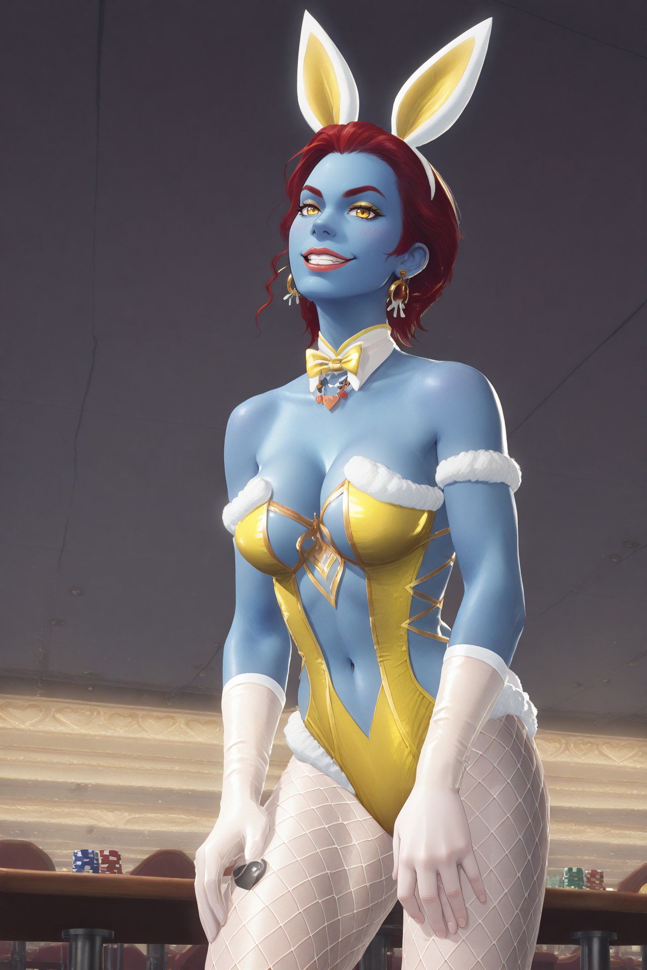 Normal Version: fishnet pantyhose, heart, {red|yellow|blue} leotard, fur trim, earrings, playboy bunny, rabbit tail, rabbit ears, bare shoulders, detached bowtie collar, white gloves, cleavage, navel, white high heels