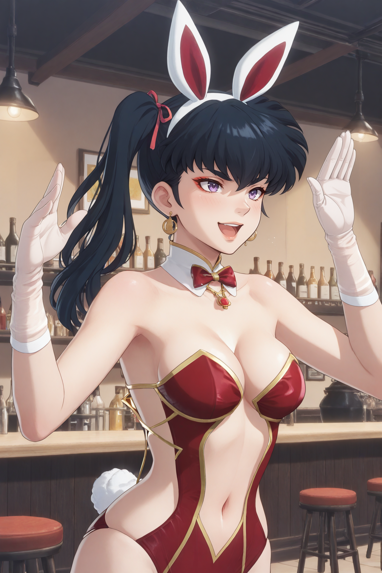 Malfunction Version: Malfunction, alternate costume, earrings, detached collar, white gloves, playboy bunny, rabbit tail, rabbit ears, {red|yellow|blue} leotard, gold trim, cleavage, navel, backless outfit, white high heels