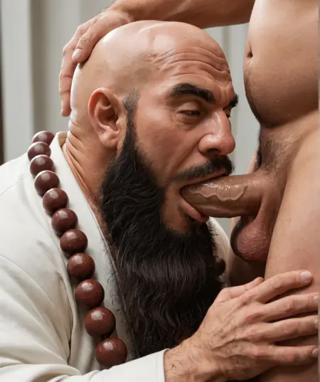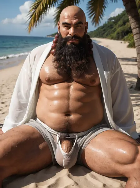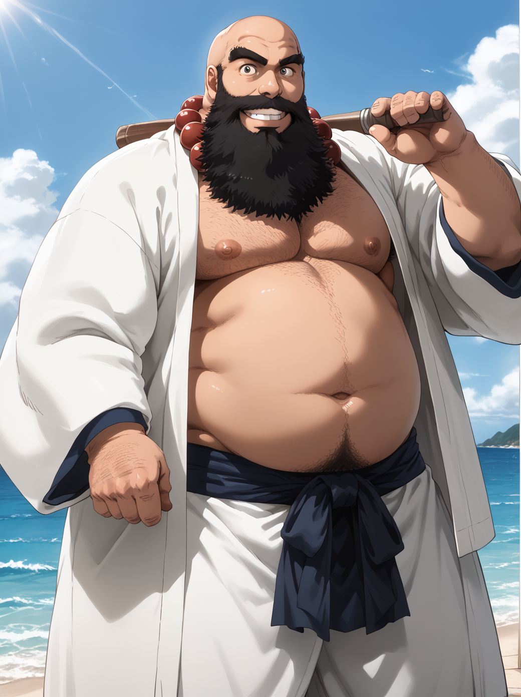 ichibēhyōsube, beard, long beard, facial hair, bald, big prayer beads, japanese clothes,
