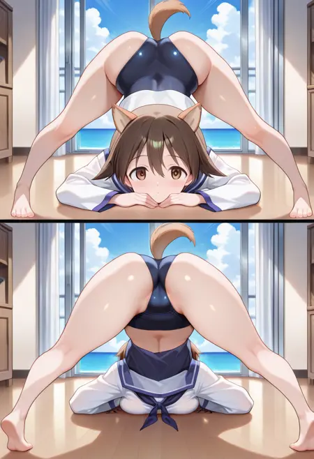 worst quality, old, low quality, lowres, signature, username, blurry, sketch, jagged lines, 3d, bed, tatami, upside-down, looking through own legs