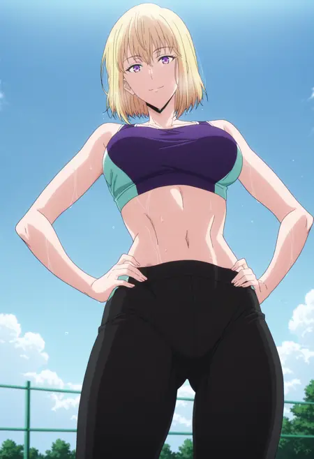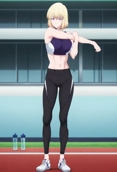 服装2: 运动内衣,露脐,水瓶,黑色长裤,露肩,运动鞋,瑜伽裤,