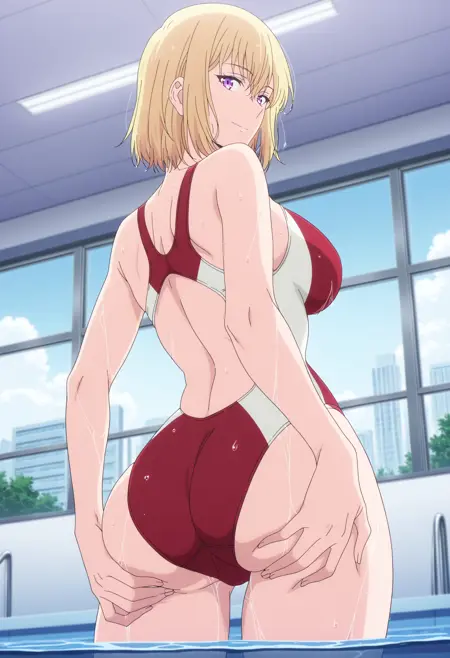 복장: 수영복, 경기용 수영복, 빨간 한조각 수영복, 한조각 수영복,