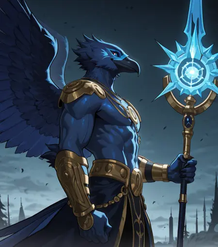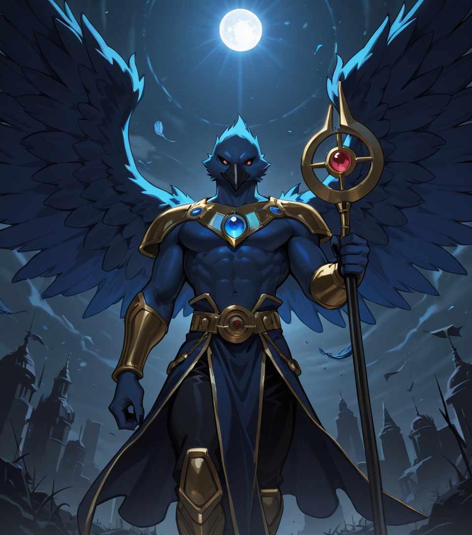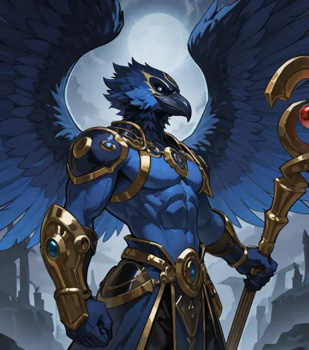 このLoRA用のプロンプトは、exalted_lord_of_change、Tzeentch、raven、raven headed、wings、blue body、blue feathers、blue skin、Tzeentchian_exalted_lord_outfit、eye_of_Tzeentch、mark_of_Tzeentch、staff、chaos_demon、Tzeentchian_chaos_warp、Tzeentch_corruption、Tzeentchian_domain、sceneryです。