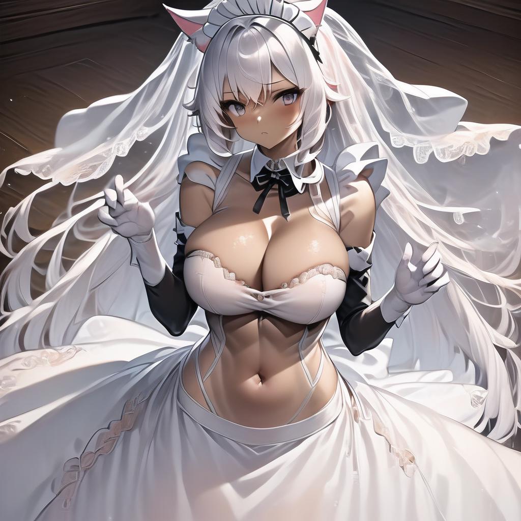 1girl,Valiorsa,extremely long hair, white grey eyes, midriff, navel, large breast, big waist, big hips, big thighs, big ass, wild hair,white hair, messy hair, light, dynamic lighting, light, dark skin,off-shoulders,black elbow gloves, white gloves, white hair,cleavage, bare stomach,cat ears,bridal veil,wedding dress veil,white dress