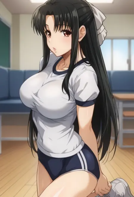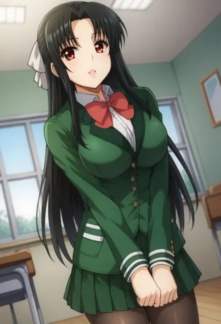 Nana Chigusa: 1girl,solo,nana chigusa,brown eyes,black hair,long hair,school uniform,blazer,long sleeves,green skirt,pleated skirt,hair ribbon,white ribbon,bow,red bowtie,pantyhose,large breasts,v arms,socks,brown shoes