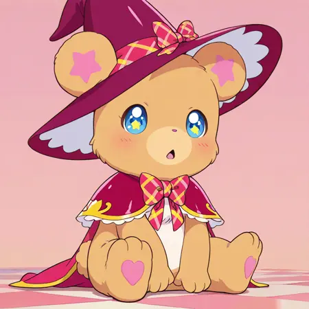 mofurun \(mahou girls precure!\), 1other, teddy bear, no humans, furry, bear ears, star hair ornament, blue eyes, star in eye, symbol in eye, star-shaped pupils, sparkling eyes, symbol-shaped pupils, pink bowtie, pink neckwear, brooch, bear tail
