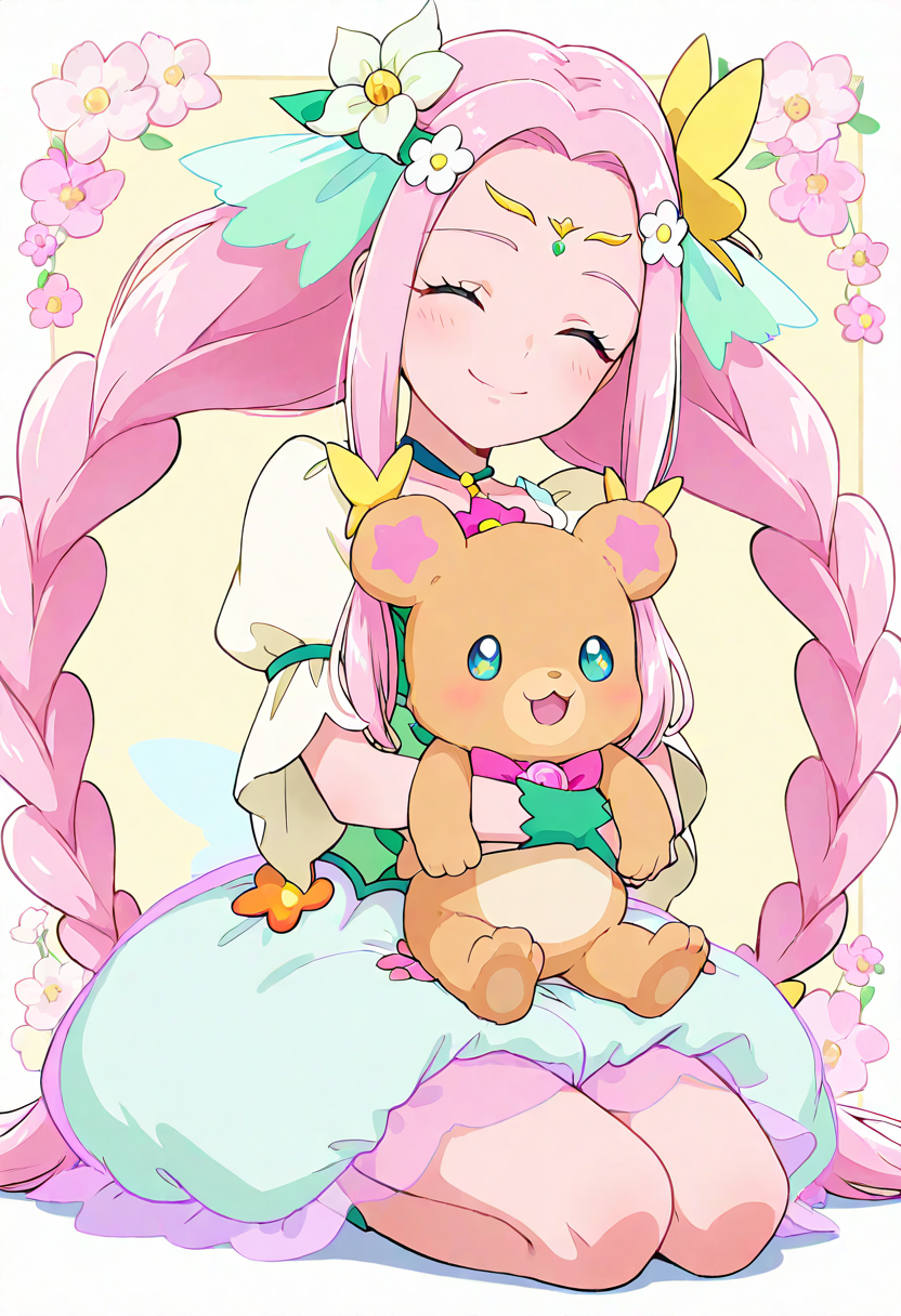 cure felice, pink hair, sidelocks, twintails, twin braids, very long hair, parted bangs, shiny hair, hair intakes, hair flower, white flower, pink eyes, green eyes, flower in eye, multicolored eyes, flower-shaped pupils, eyelashes, circlet, earrings, butterfly hair ornamentFull body 全身