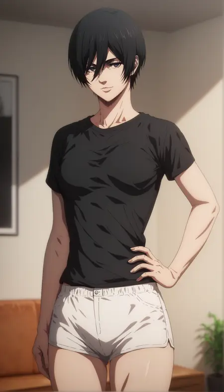 MikasaSeason4, 1girl, 검은 머리, 단발, 눈 사이에 머리카락, 검은 눈, 중간 크기의 가슴