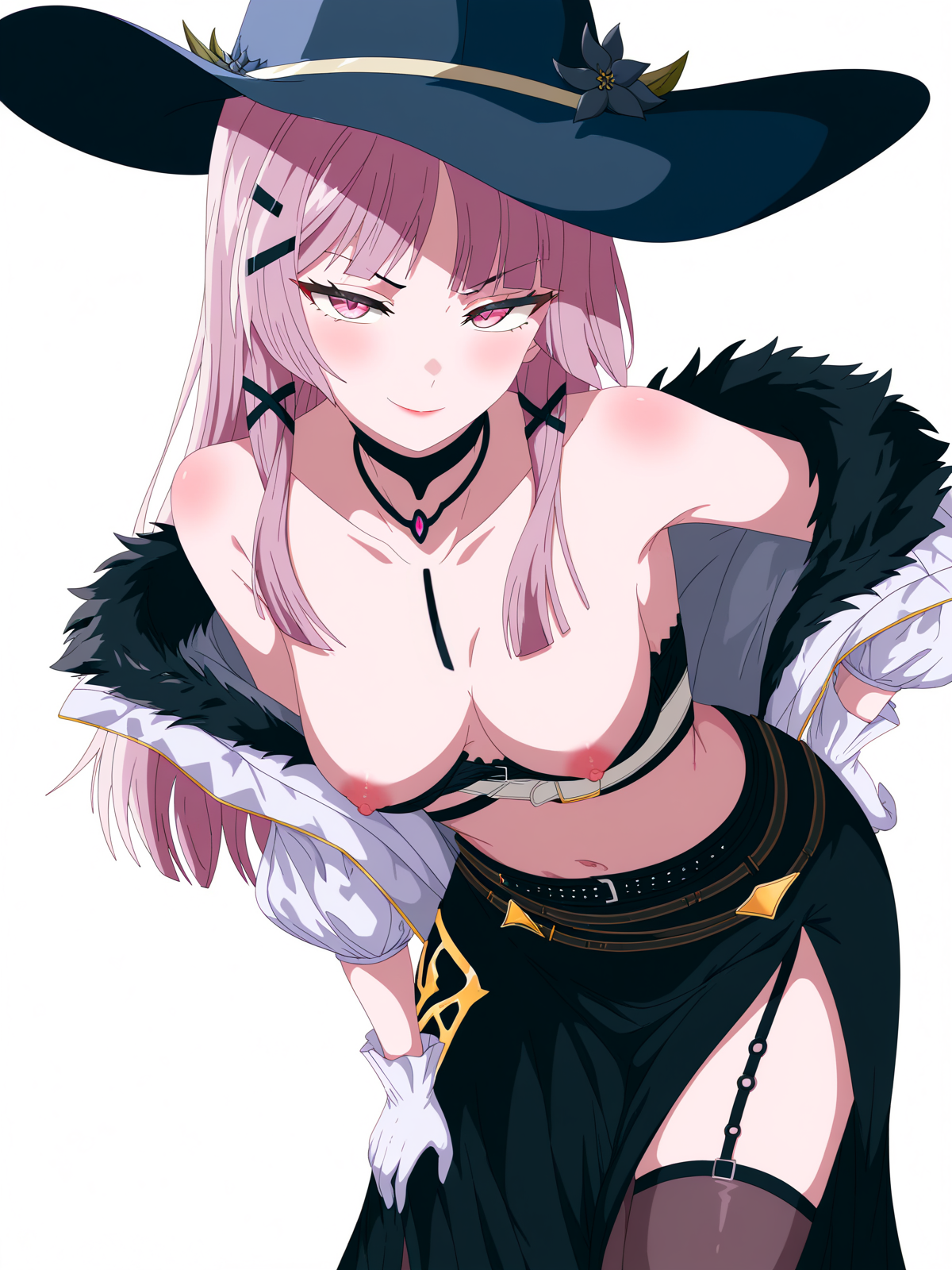 midnight gala lilias \(epic seven\), pink hair, long hair, bangs, pink eyes, hat, jewelry, black bra, black skirt, long skirt, white jacket, fur trim, open jacket, off shoulder, belt, choker, garter straps, thighhighs, white gloves, navel, bare shoulders, cleavage, medium breasts