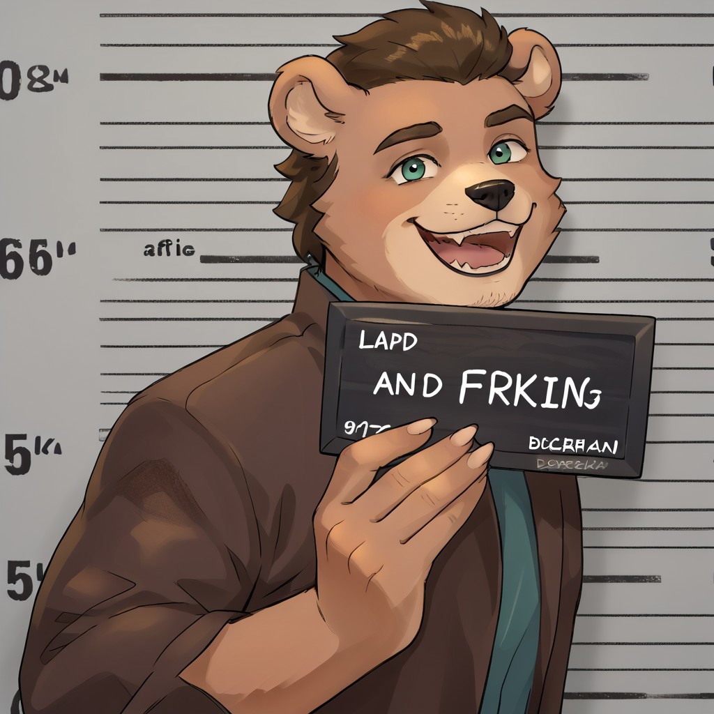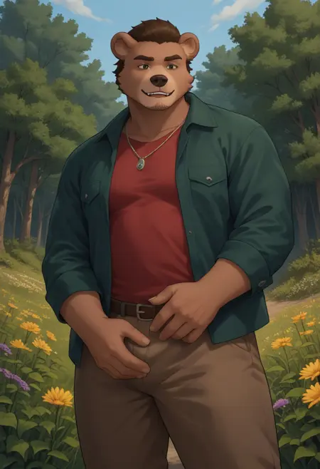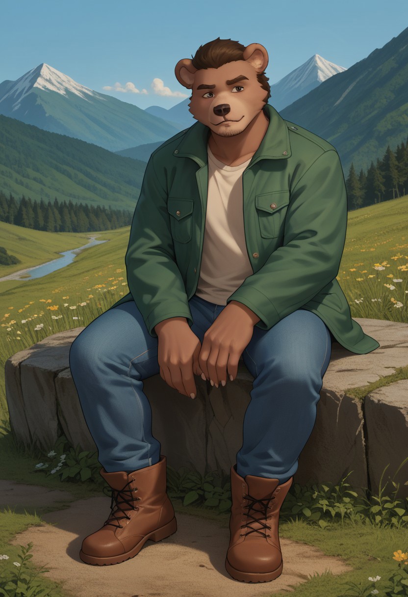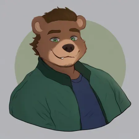 Blue tshirt, green jacket, brown boots, hairstyle backwards, Bear, anthro, furry, chubby, green eyes
