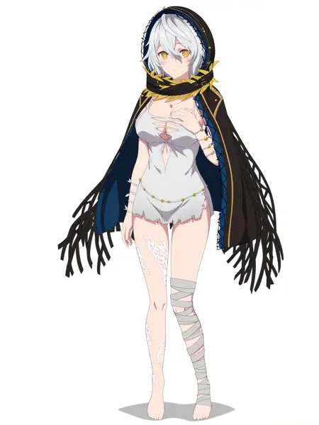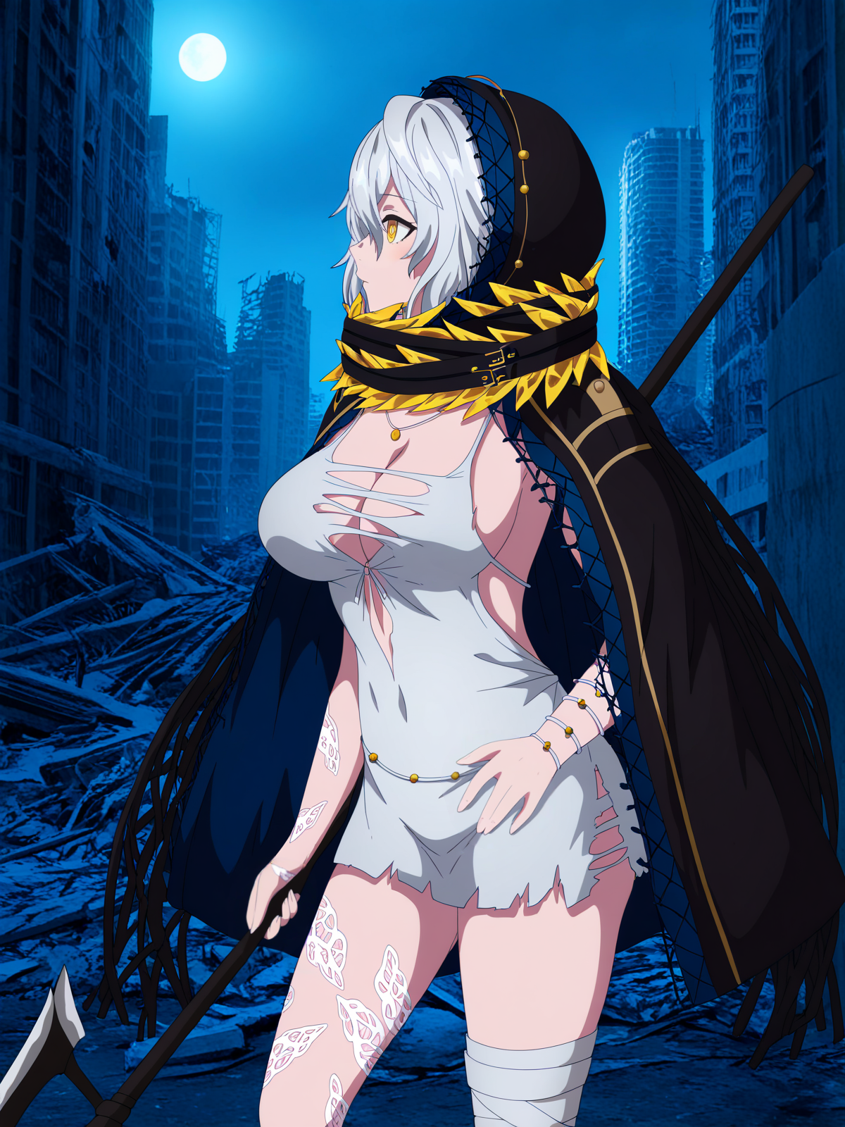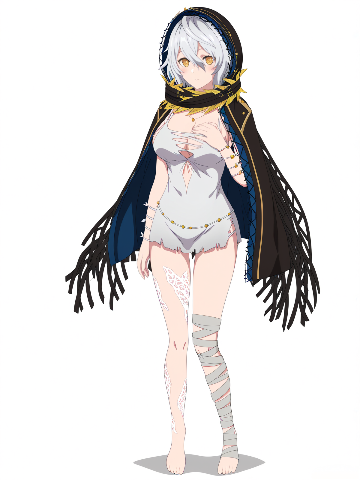 io \(code vein\), white hair, short hair, yellow eyes, hood, cloak, white dress, torn dress, spaghetti strap, bandaged leg, asymmetrical legwear, necklace, cleavage, large breasts