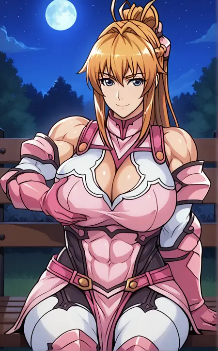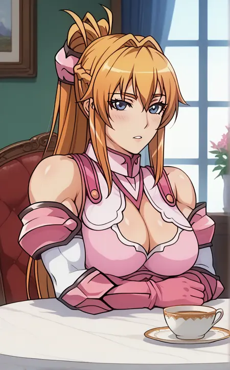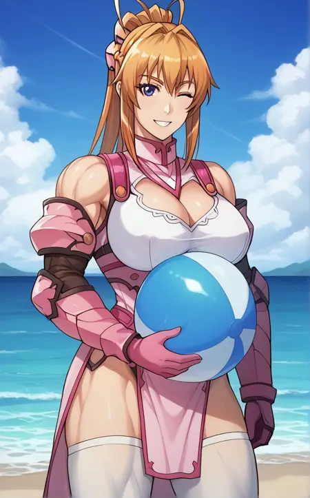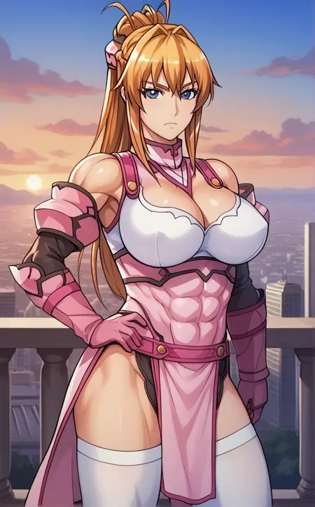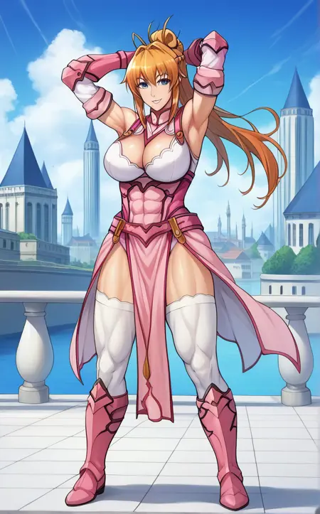 MAIN_ButanoGotoki_Anrietta_ownwaifu, 1girl, bare shoulders, blonde hair, blue eyes, gigantic breasts, long hair, muscular female, ponytail, cleavage cutout, large breasts, armor, hair between eyes, hair intakes, gauntlets, hair ornament, sidelocks, detached sleeves, abs, elbow gloves, pantyhose, thighhighs, turtleneck, bodysuit, french braid, orange hair, sleeveless, antenna hair, cleavage, gloves, greaves, pelvic curtain, pink dress, sheath, pink gloves, sheathed, toned, white thighhighs,