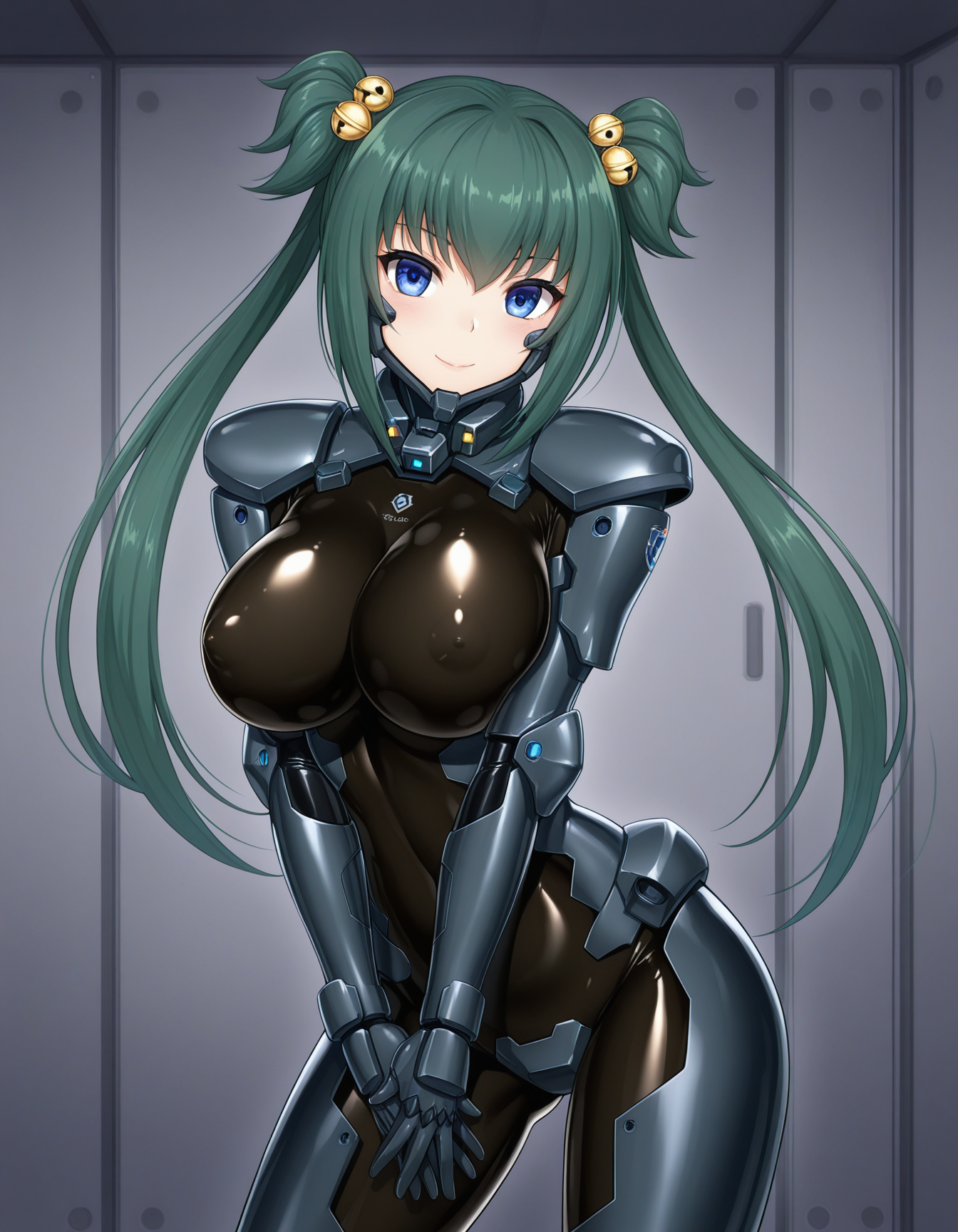 cui yifei, green hair, long twintails, hair ornament, jingle bell, blue eyes