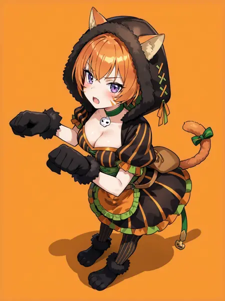 Add "furry female,animal ears,hood,facepaint,choker,paw gloves,dress,belt pouch,striped leggings,paw shoes,cat tail" for her halloween look.