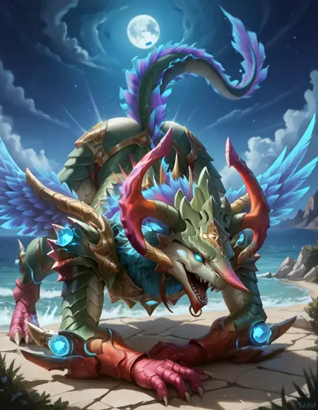 📝 Тиамат — первородная царица и богиня солёного моря, представленная в игре SMITE как могущественный дракон. Она является первым божеством вавилонского пантеона и обладает уникальными игровыми механиками с двумя стойками: воздушной и наземной. В воздушной стойке Тиамат использует дальние магические атаки и призывает порождений, тогда как в наземной — переключается на мощные атаки ближнего боя и становится выносливее. Её внешний облик сочетает черты дракона с величественной и устрашающей аурой..